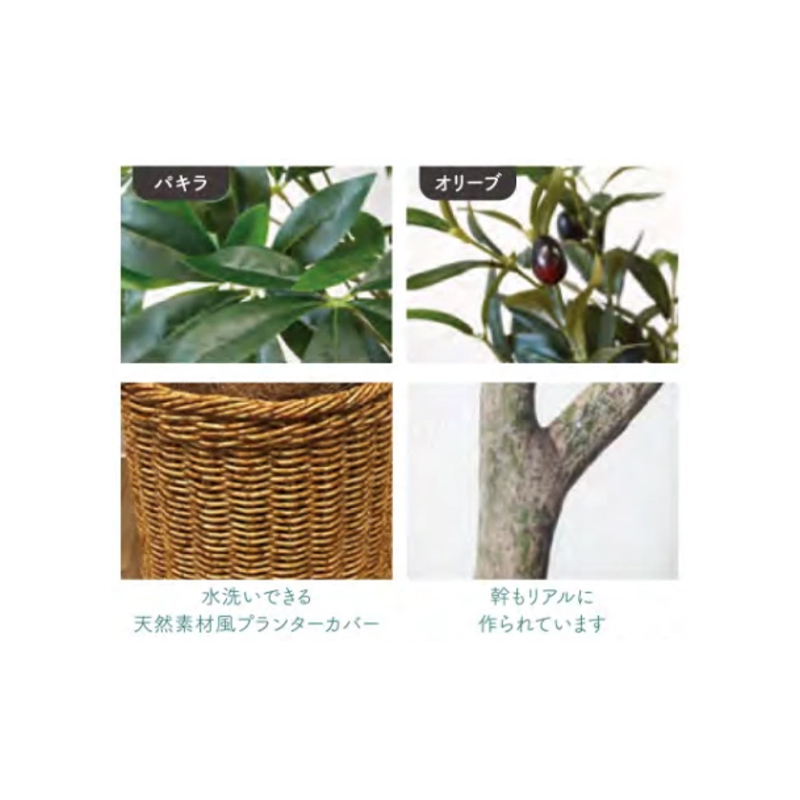 | 素材 | 葉/PE、PEVA(パキラ) PE、PEs(オリープ) 器/PP、セメント、砂 カバー/PP、EVA、TPR |
