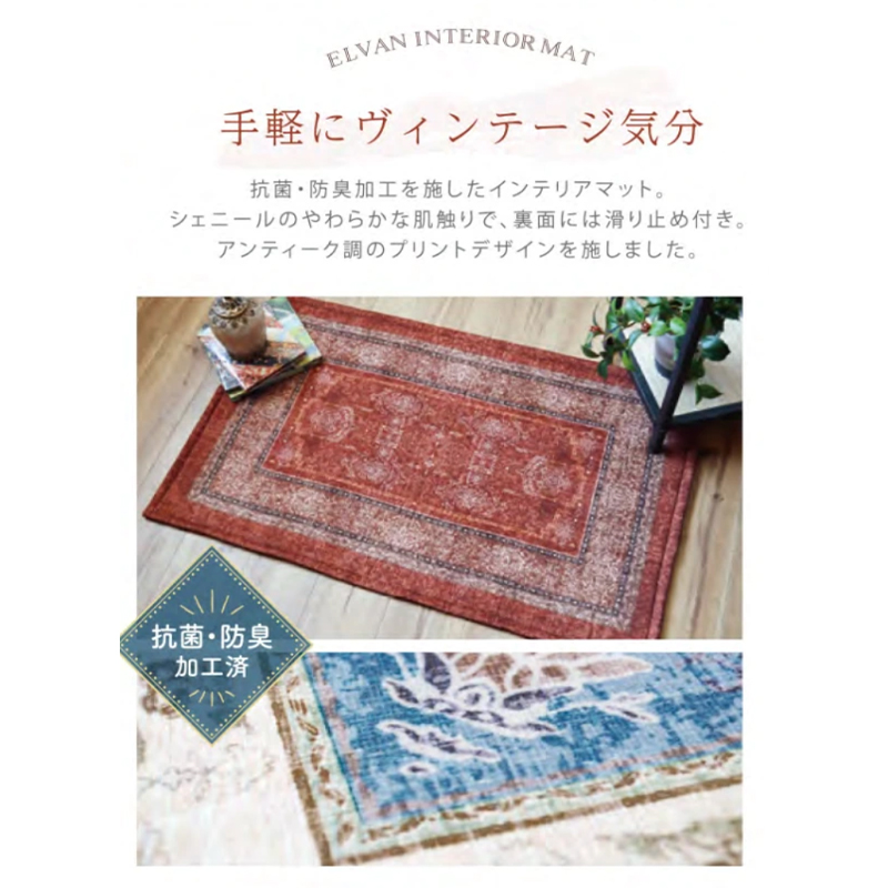 抗菌、防臭を施してあるので、玄関やキッチン、ベッドの足元にもいつでも清潔にお使いいただけます。シェニールのやわらかな肌触りでおすすめ。※裏面に滑り止め付きアンティーク調のプリントがお部屋のアクセントになります