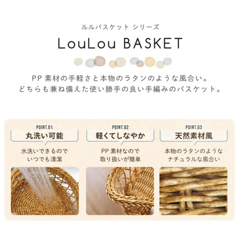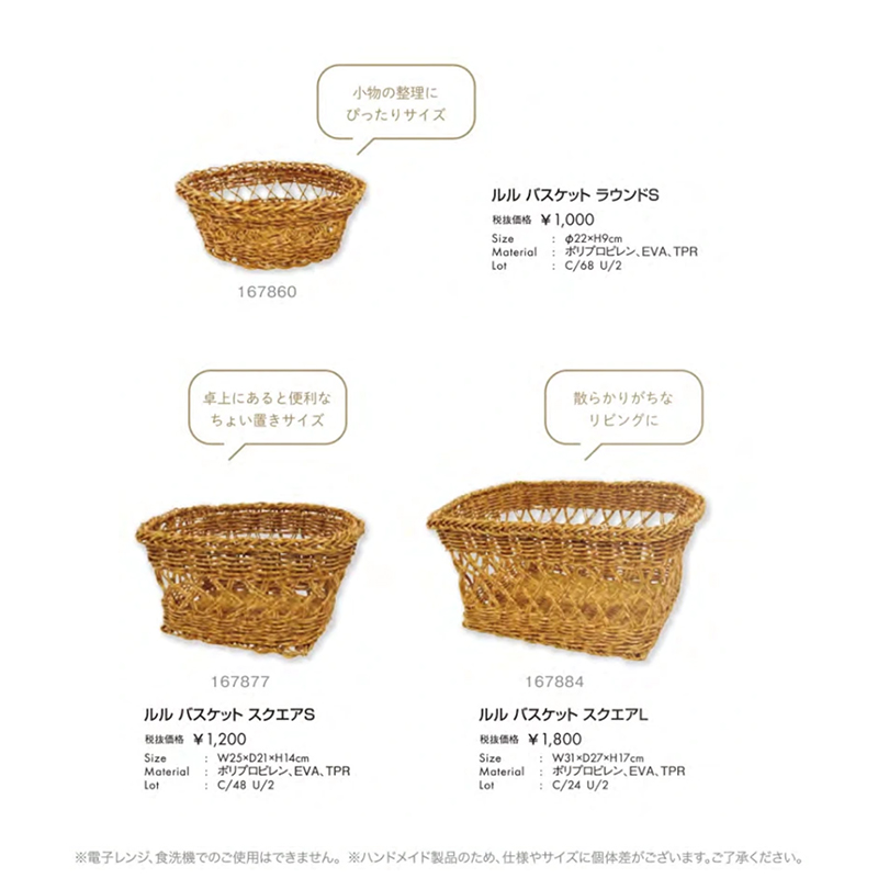 | サイズ | ラウンドS:Φ22xH9cm スクエアS:W25xD21xH14cm スクエアL:W31xD27xH17cm トレイ:W39×D30.5×H4.5cm(ハンドル含まず) ティッシュケース:25.5x14xH9cm |