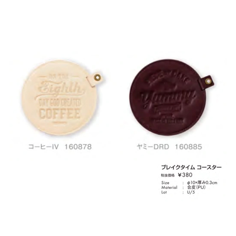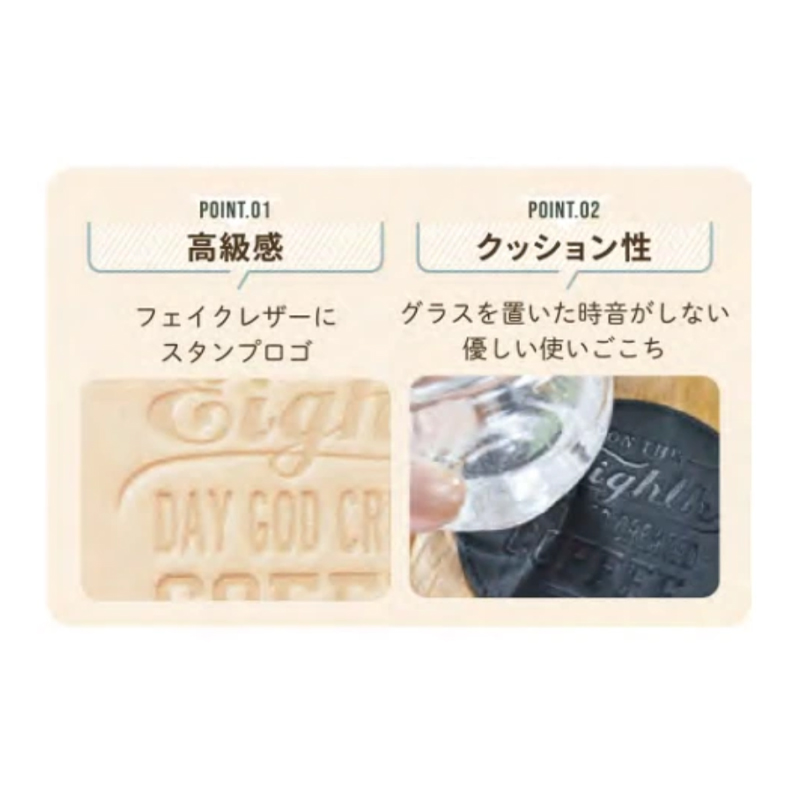 質感のある合皮にロゴをスタンプしたおしゃれなコースター。ユニセックスなデザインがギフトにもおすすめです