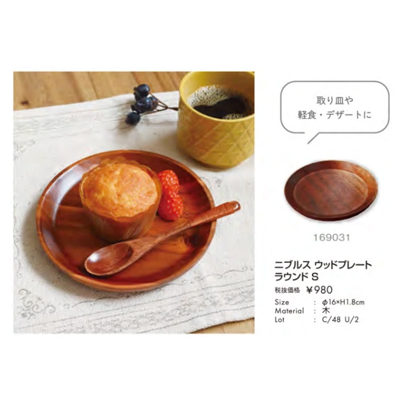 | サイズ | ラウンドS:Φ16xH1.8cm ウッドプレート ラウンドL:Φ20xH1.8cm ウッドプレート 仕切りスクエア:W28xD21.5xH1.8m ウッドプレート 仕切りラウンド:Φ25.5xH1.8m カッティングボードS:W12.7xD27×H1.3cm |
