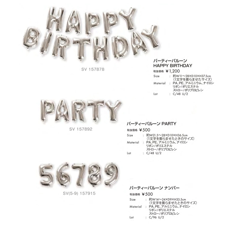 | サイズ | HAPPY BIRTHDAY SV:約W11~28×D10×H37.5cm PARTY SV:W約21.5?28xD約10xH約36.5cm(1文字を膨らませた時のサイズ) ナンバーSV(5-9):W約14?24xD約9xH約33.5cm(1文字を膨らませた時のサイズ) |