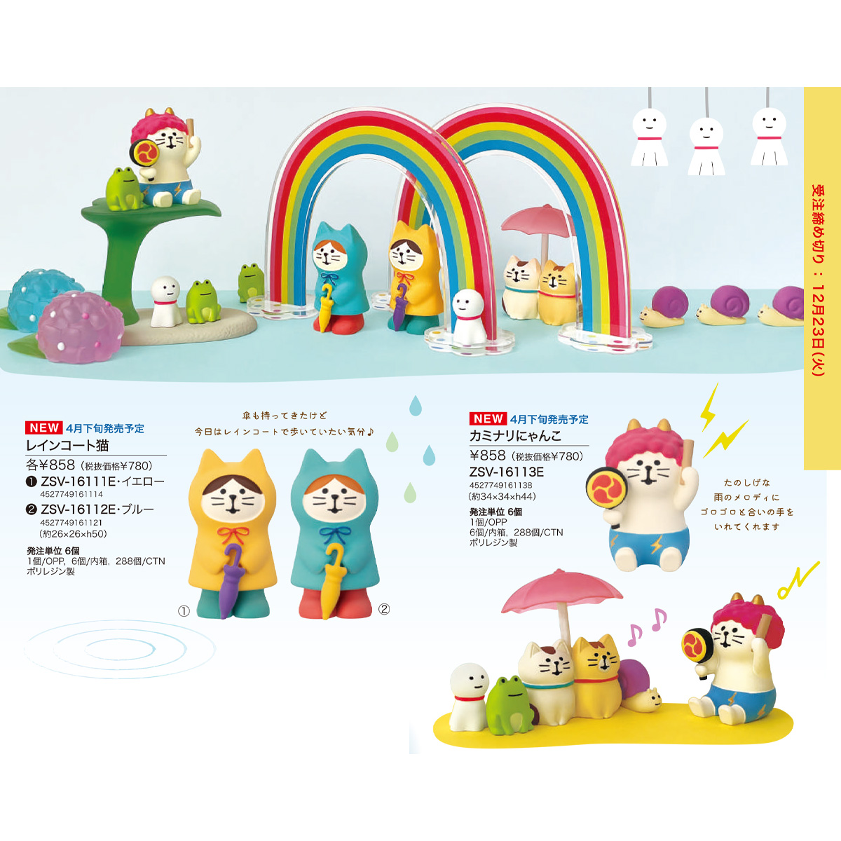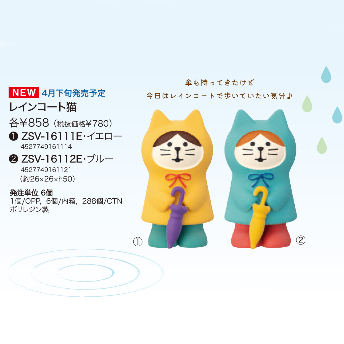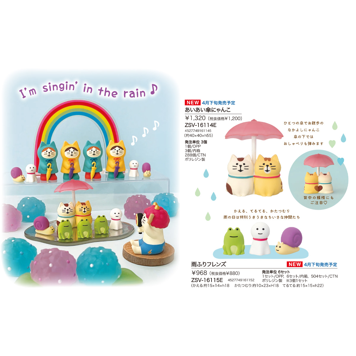 | サイズ | 【DC:ZSV-16111E レインコート猫 イエロー】約26×26×h50、本体重量:29g 【DC:ZSV-16112E レインコート猫 ブルー】約26×26×h50、本体重量:29g 【DC:ZSV-16113E カミナリにゃんこ】約34×34×h44、本体重量:28g 【DC:ZSV-16114E あいあい傘にゃんこ】約40×40×h55、本体重量:31g 【DC:ZSV-16115E 雨ふりフレンズ】かえる:約15×14×h18、かたつむり:約10×23×H18、てるてる:約15×15×h22、本体重量:12g |