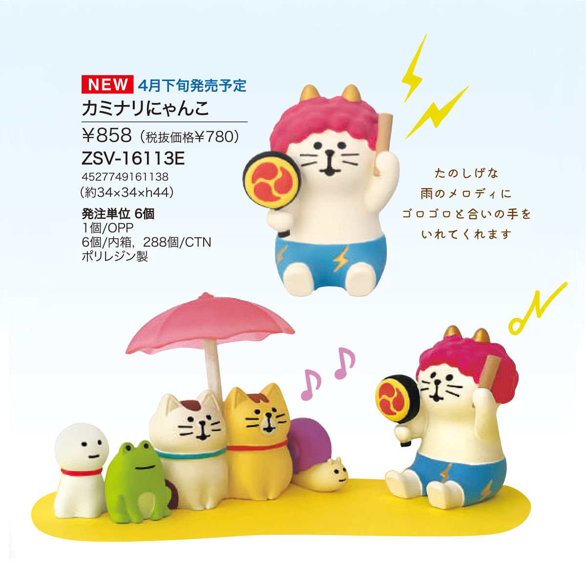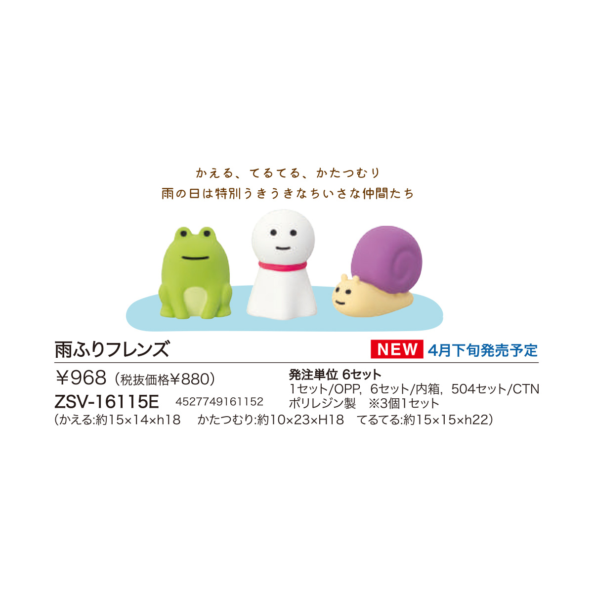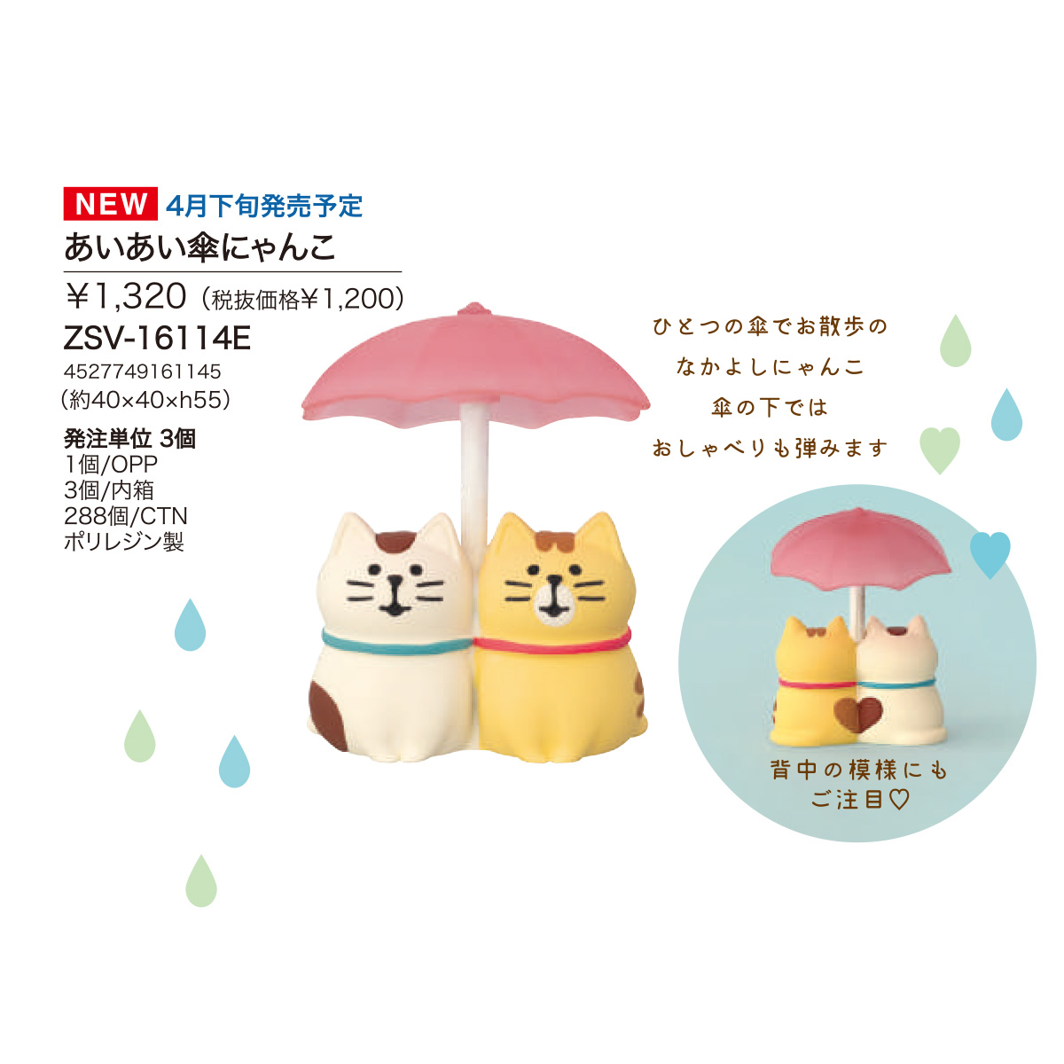 | サイズ | 【DC:ZSV-16111E レインコート猫 イエロー】約26×26×h50、本体重量:29g 【DC:ZSV-16112E レインコート猫 ブルー】約26×26×h50、本体重量:29g 【DC:ZSV-16113E カミナリにゃんこ】約34×34×h44、本体重量:28g 【DC:ZSV-16114E あいあい傘にゃんこ】約40×40×h55、本体重量:31g 【DC:ZSV-16115E 雨ふりフレンズ】かえる:約15×14×h18、かたつむり:約10×23×H18、てるてる:約15×15×h22、本体重量:12g |