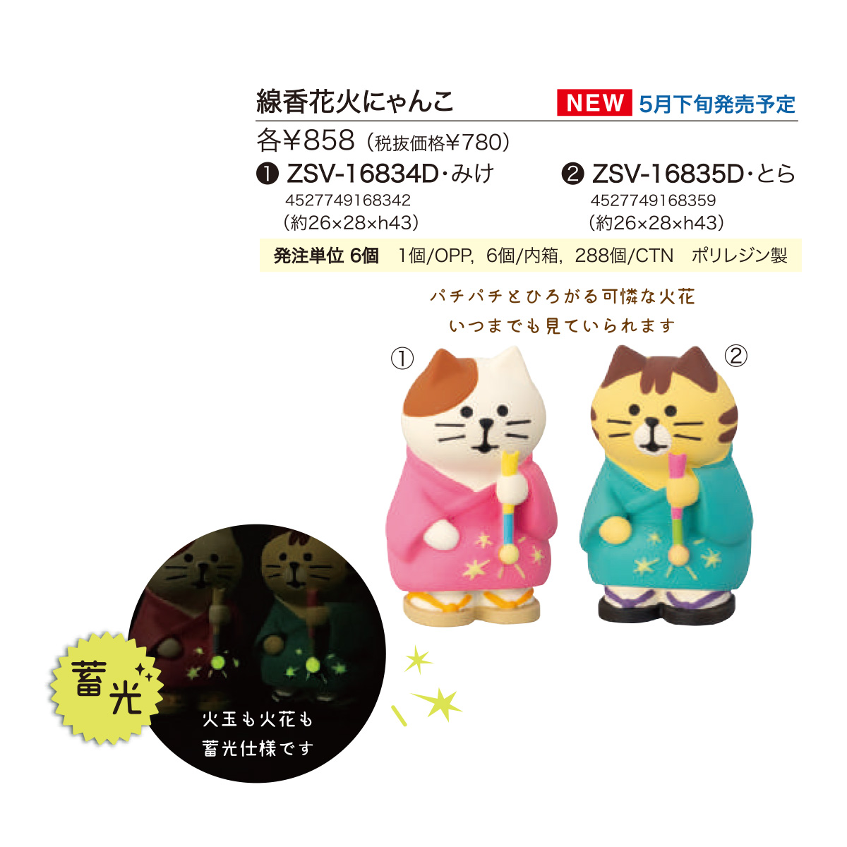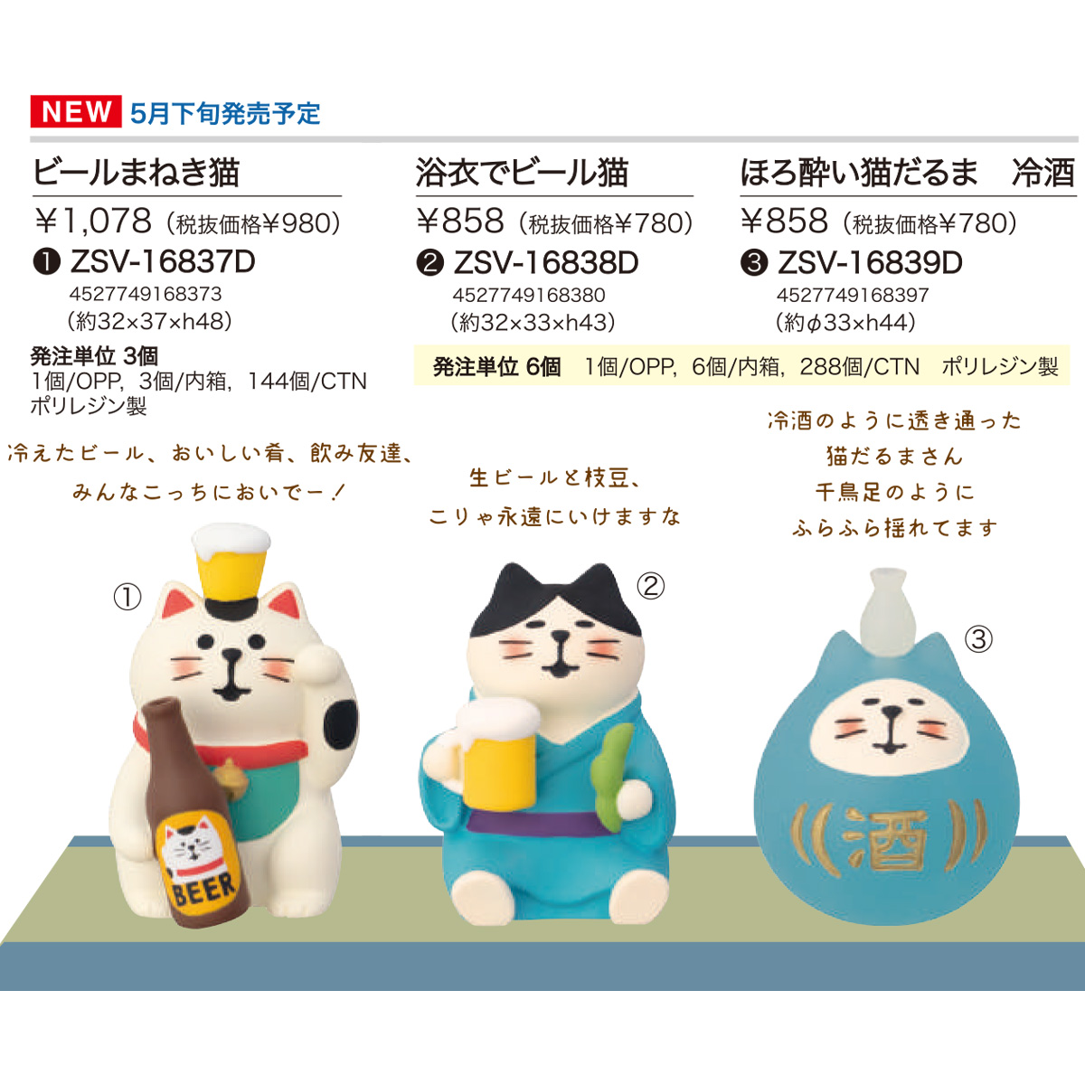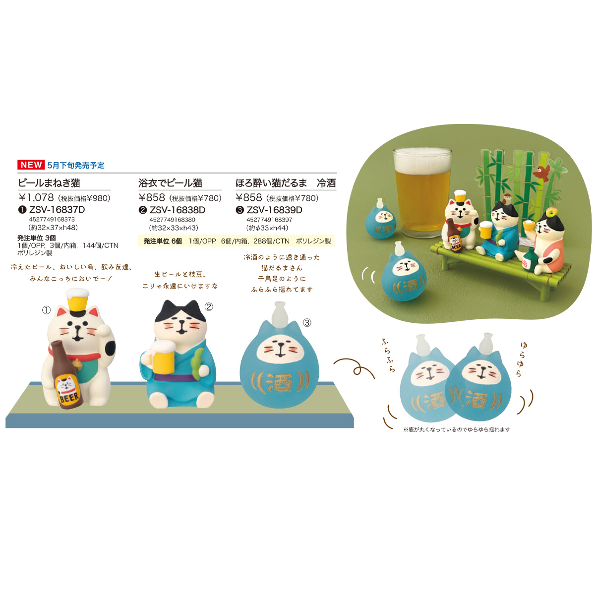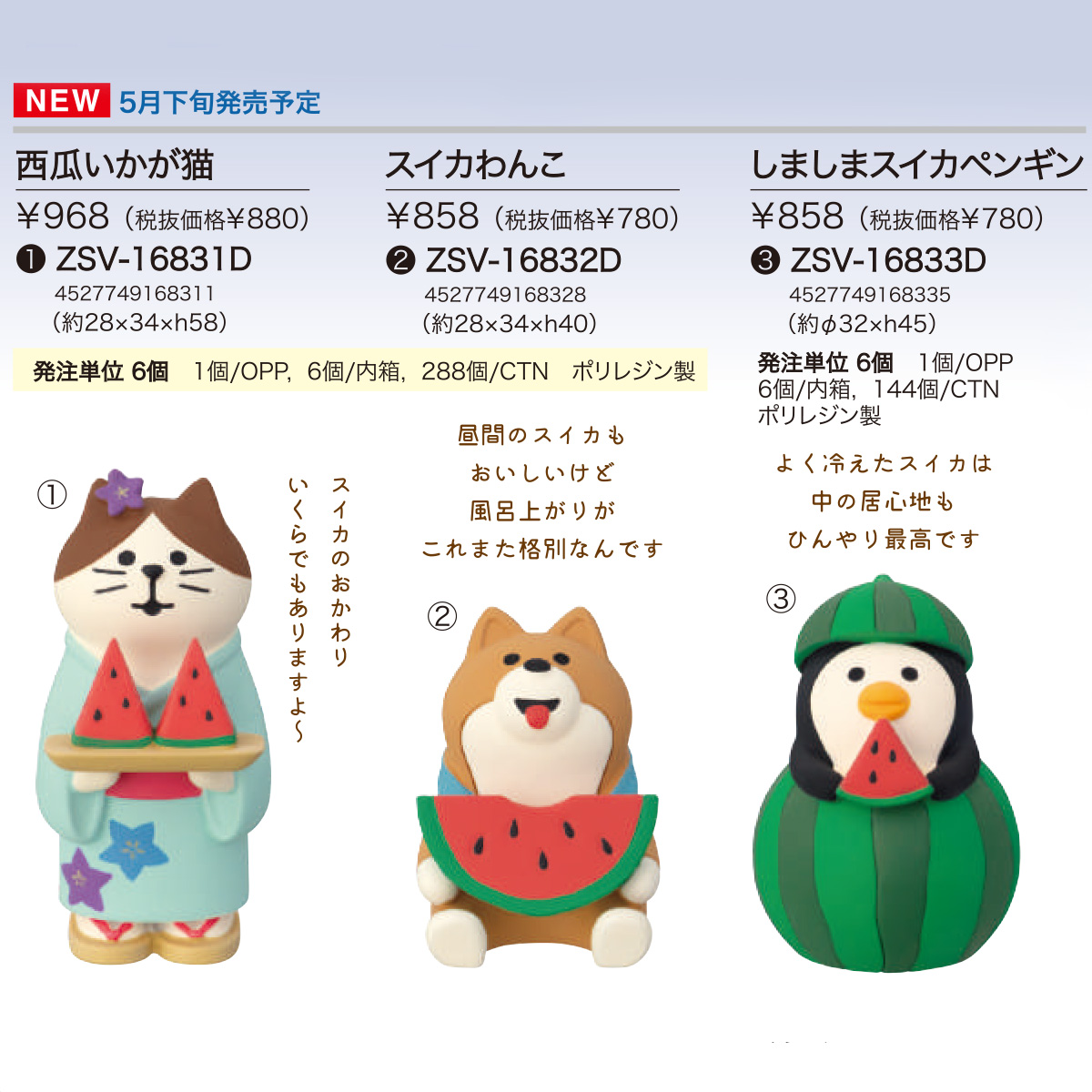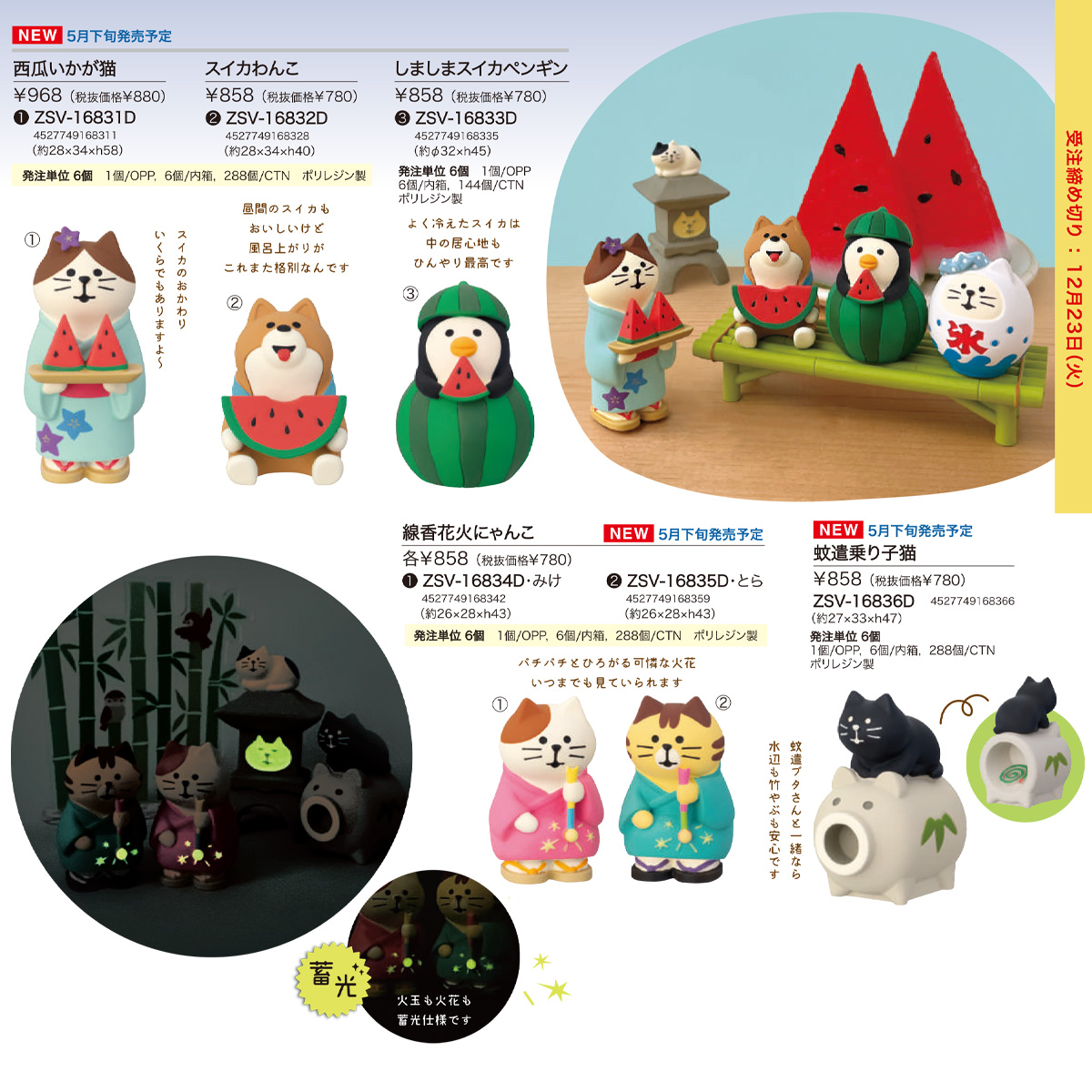 | サイズ | 【DC:ZSV-16831D 西瓜いかが猫】約28×34×h58、本体重量:35g 【DC:ZSV-16832D スイカわんこ】約28×34×h40、本体重量:28g 【DC:ZSV-16833D しましまスイカペンギン】約φ32×h45、本体重量:39g 【DC:ZSV-16834D 線香花火にゃんこ みけ】約26×28×h43、本体重量:23g 【DC:ZSV-16835D 線香花火にゃんこ とら】約26×28×h43、本体重量:23g 【DC:ZSV-16836D 蚊遣乗り子猫】約27×33×h47、本体重量:31g 【DC:ZSV-16837D ビールまねき猫】約32×37×h48、本体重量:36g 【DC:ZSV-16838D 浴衣でビール猫】約32×33×h43、本体重量:32g 【DC:ZSV-16839D ほろ酔い猫だるま 冷酒】約φ33×h44、本体重量:24g |