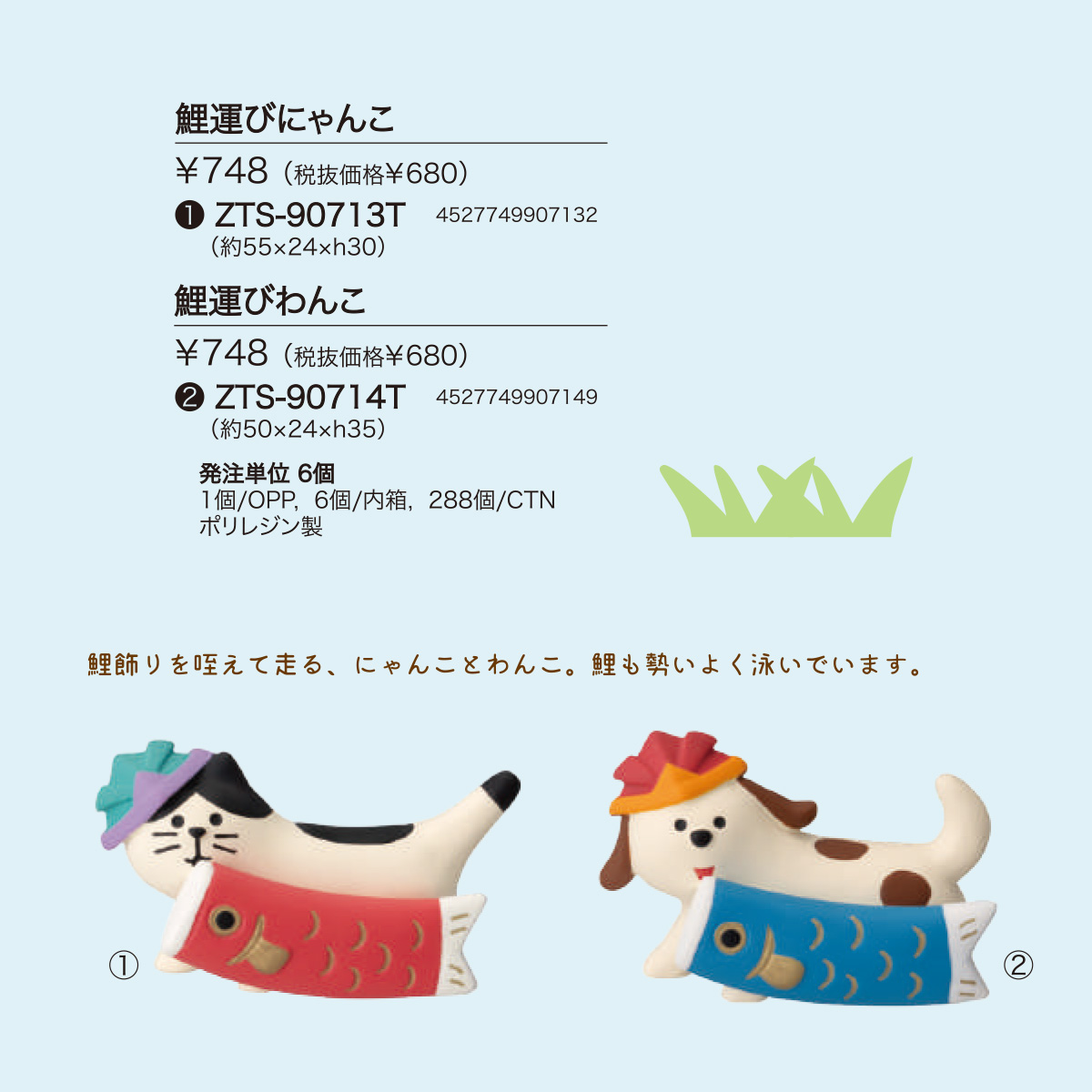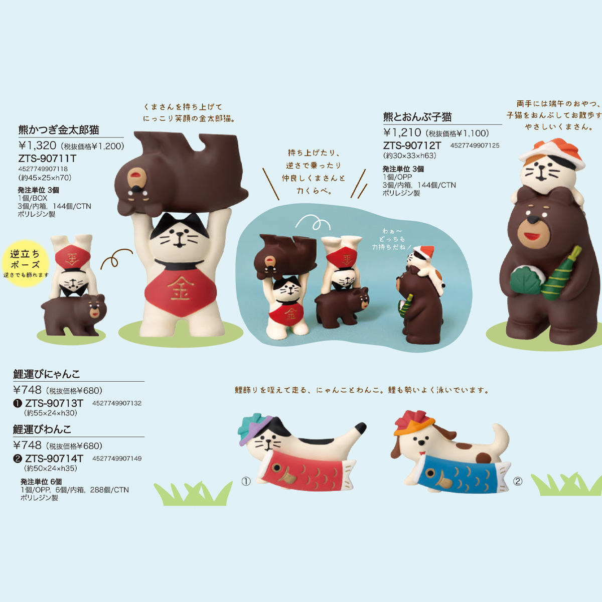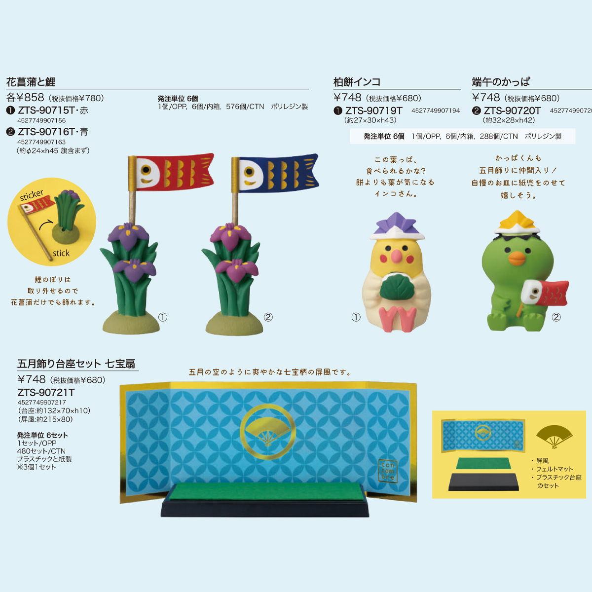 | 素材 | 【DC:ZTS-90711T 熊かつぎ金太郎猫】ポリレジン、ベトナム製 【DC:ZTS-90712T 熊とおんぶ子猫】ポリレジン、ベトナム製 【DC:ZTS-90713T 鯉運びにゃんこ】ポリレジン、ベトナム製 【DC:ZTS-90714T 鯉運びわんこ】ポリレジン、ベトナム製 【DC:ZTS-90715T 花菖蒲と鯉 赤】ポリレジン、ベトナム製 【DC:ZTS-90716T 花菖蒲と鯉 青】ポリレジン、ベトナム製 【DC:ZTS-90719T 柏餅インコ】ポリレジン、ベトナム製 【DC:ZTS-90720T 端午のかっぱ】ポリレジン、ベトナム製 【DC:ZTS-90721T 五月飾り台座セット 七宝扇】プラスチックと紙、中国製 |