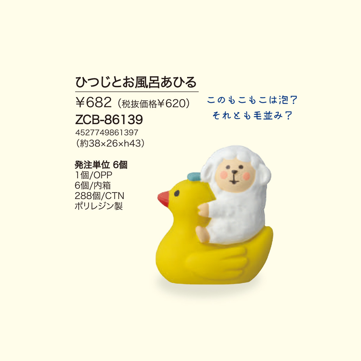 | サイズ | 【ZCB-86139 ひつじとお風呂あひる】約38×26×h43、本体重量:34g 【ZCB-86140 ゴシゴシ猫】約25×28×h40、本体重量:46g |