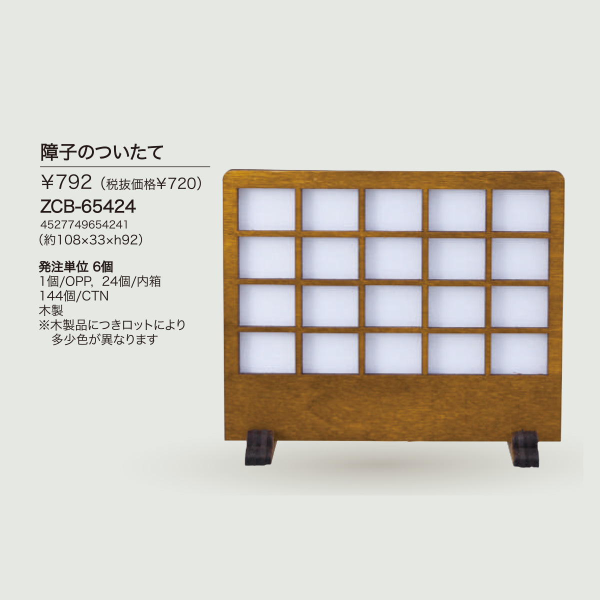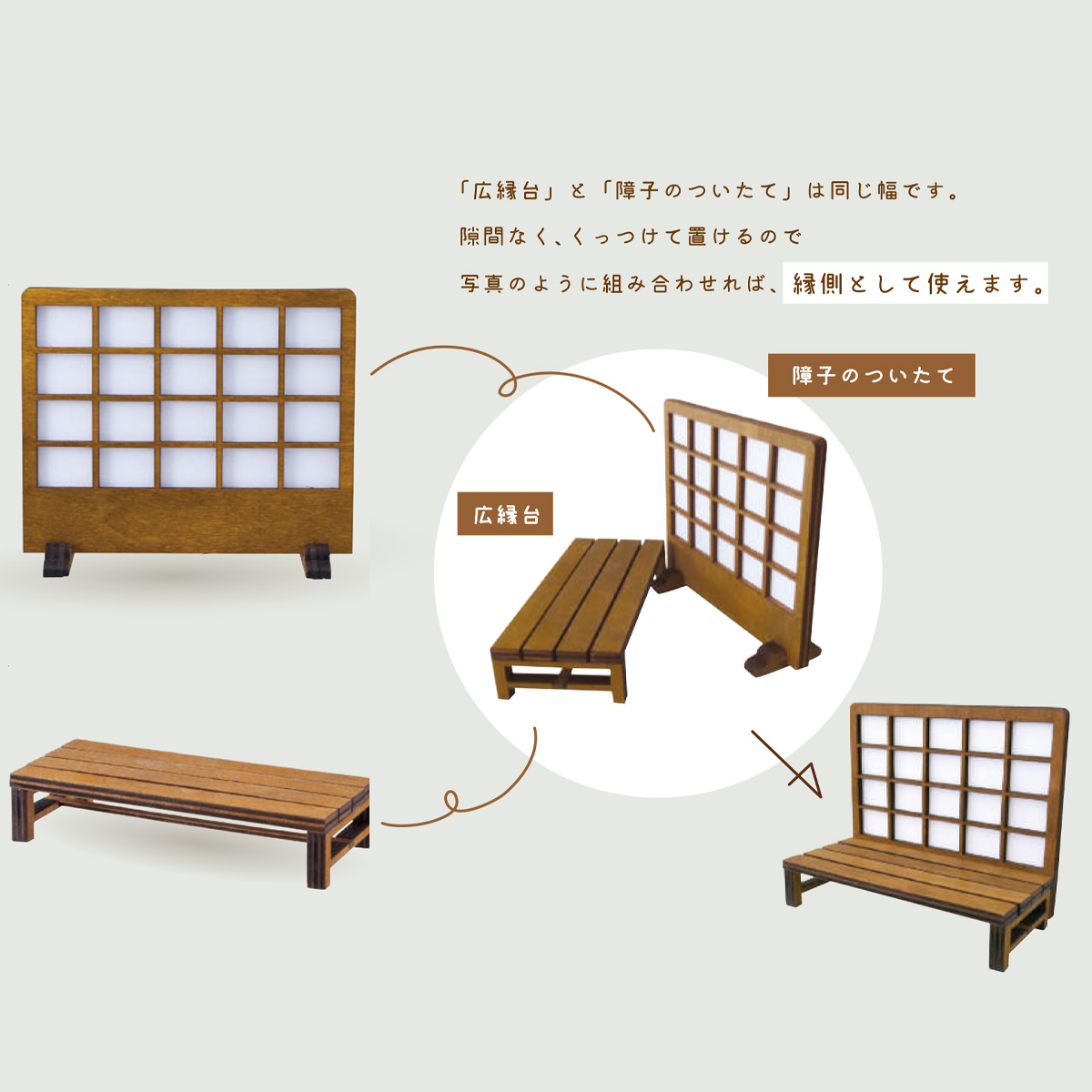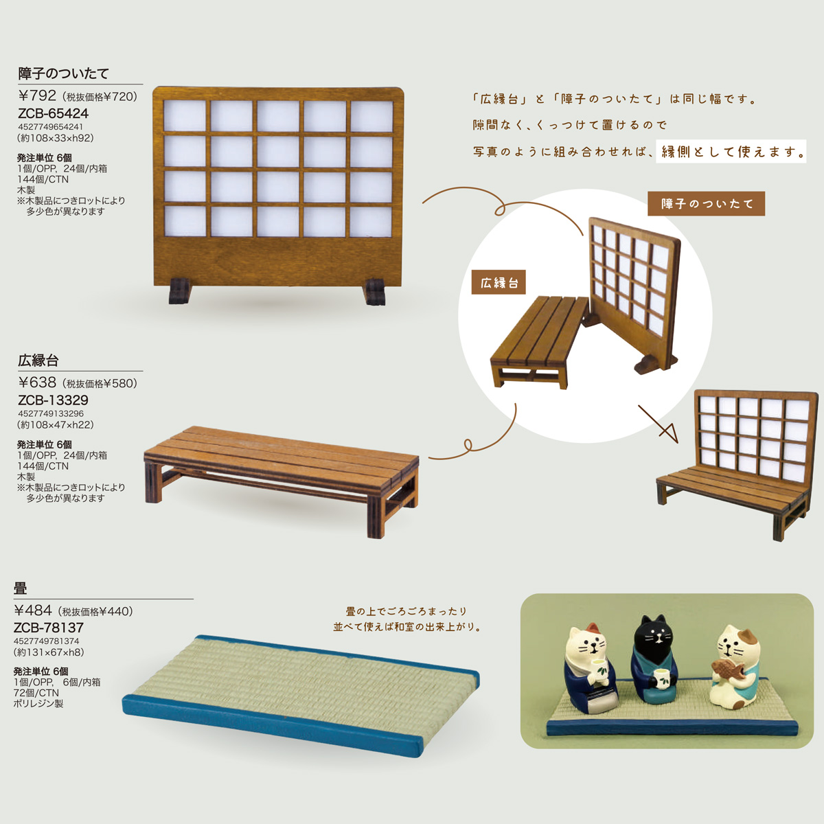 | サイズ | 【ZCB-65424 障子のついたて】約108×33×h92、本体重量:約12g 【ZCB-13329 広縁台】約108×47×h22、本体重量:14g 【ZCB-78137 畳】約131×67×h8、本体重量:105g |
