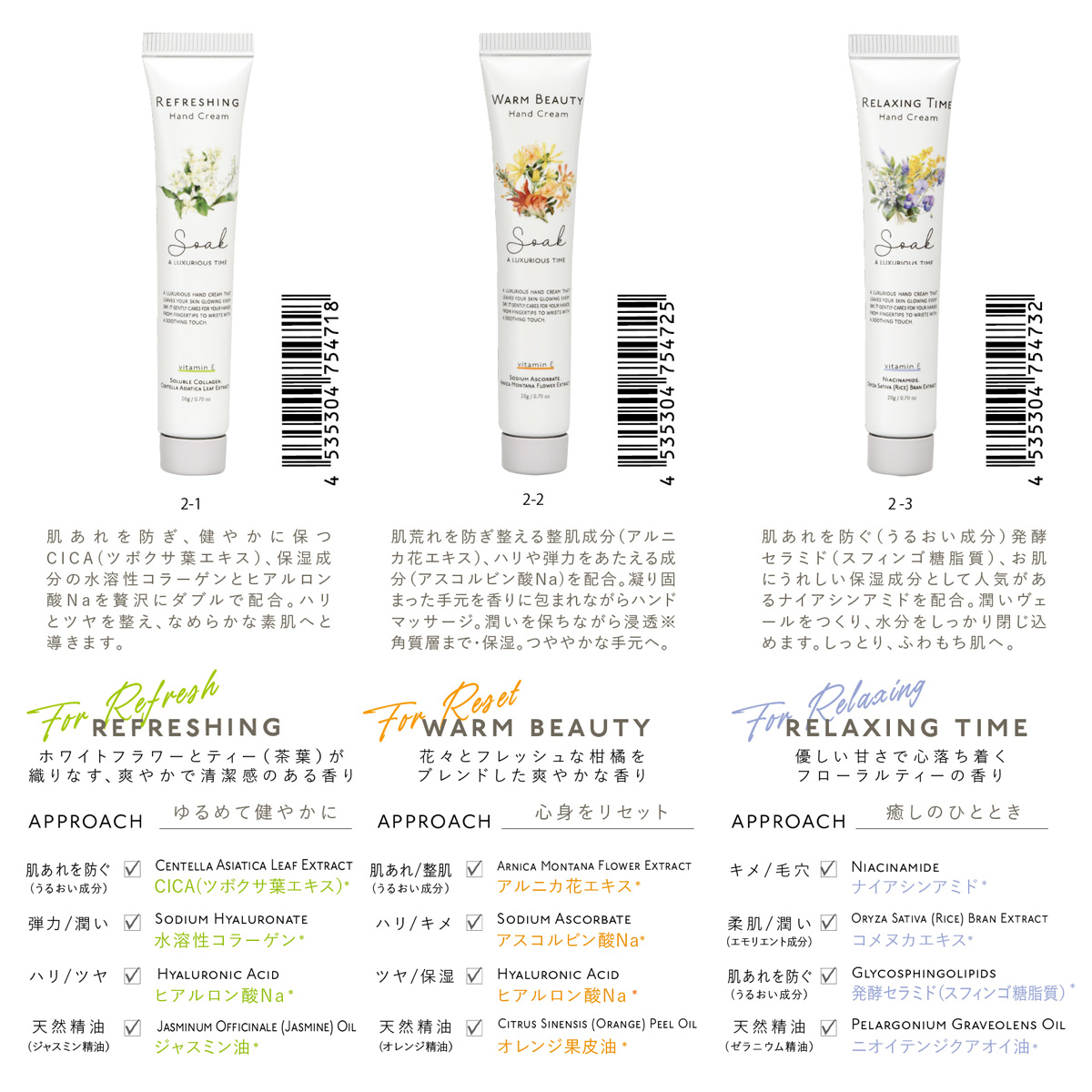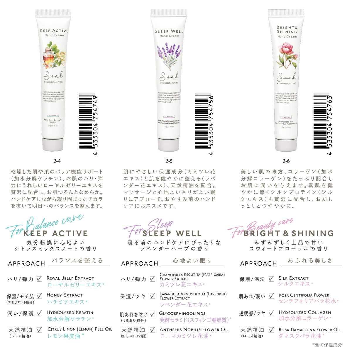 ソークハンドクリームはそんな思いから生まれた、目的ごとに特化した美容保湿成分を豊富に配合したハンドクリームです。その日の気分や肌のお悩みに合わせて、ぴったりの1本をセレクトしてみてください。