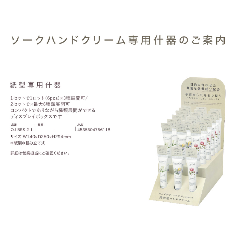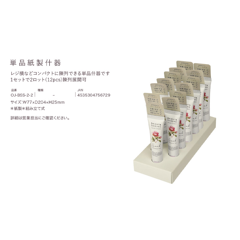 | 注意事項 | ![]() 現品テスター:XT-BSS-2-1-6 POP有 紙製専用什器:OJ-BBS-2-1 JAN:4535304756118 サイズ:W140×D250×H294mm 3種1ロットずつご購入で展開可 ※6種1ロットずつご購入の場合は什器2セットご希望ください ※組み立て式 単品紙製什器:OJ-BSS-2-2 JAN:4535304756729 サイズ:W77×D204×H25mm 2ロット(12点)陳列展開可能 ※組み立て式 POP・テスター・什器ご希望の場合は必ずご注文時にご連絡ください。 後からや先のPOP・テスターのみの送付はできません。 |