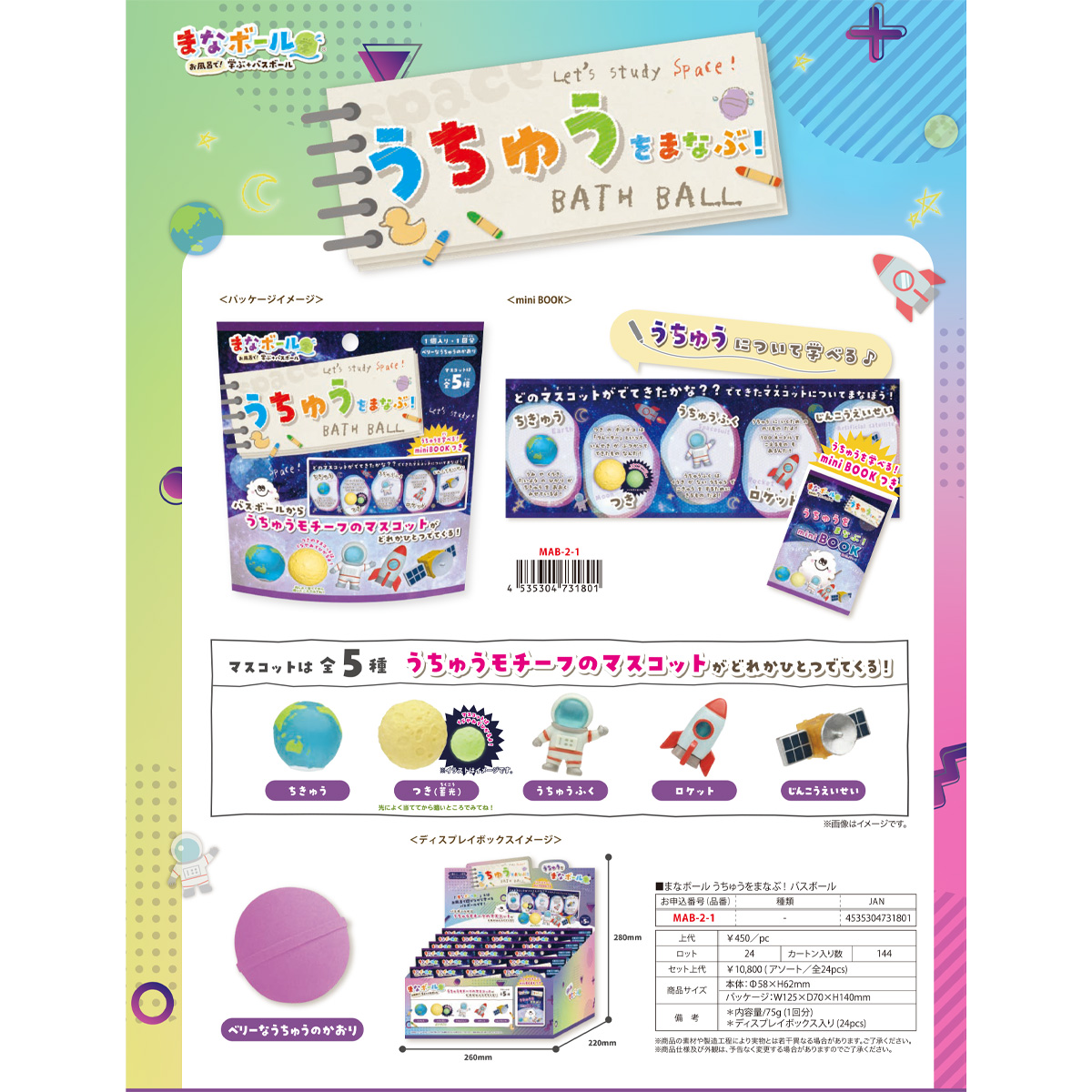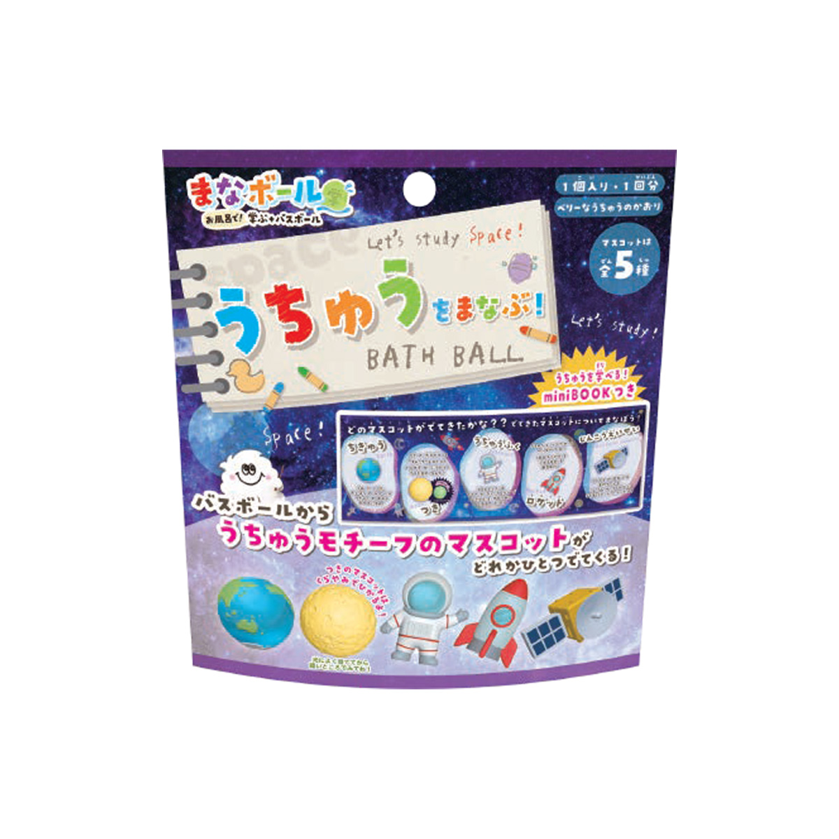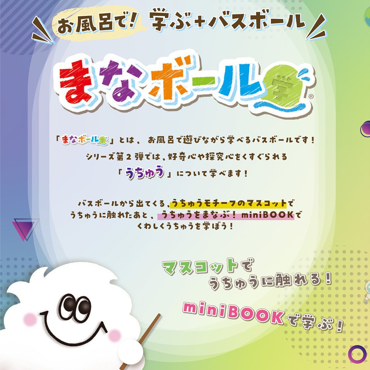 バスボールから出てくる、うちゅうモチーフのマスコットで、うちゅうに触れたあと、うちゅうをまなぶ!miniBOOKでくわしくうちゅうを学ぼう!