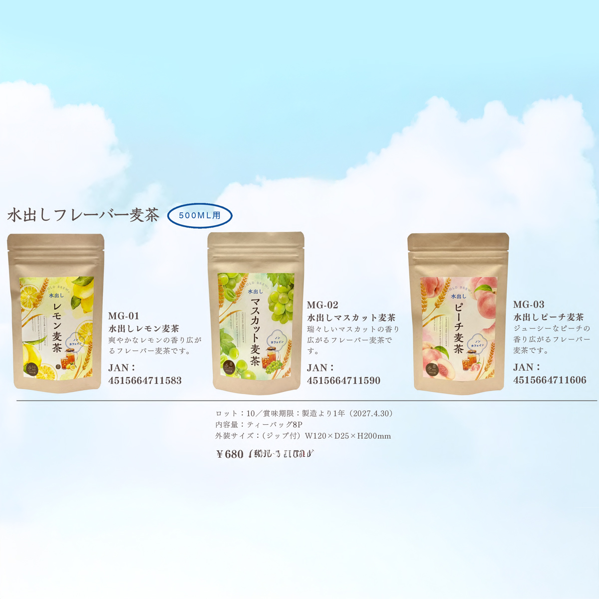 ・水出しマスカット麦茶:瑞々しいマスカットの香り広がるフレーバー麦茶です。
