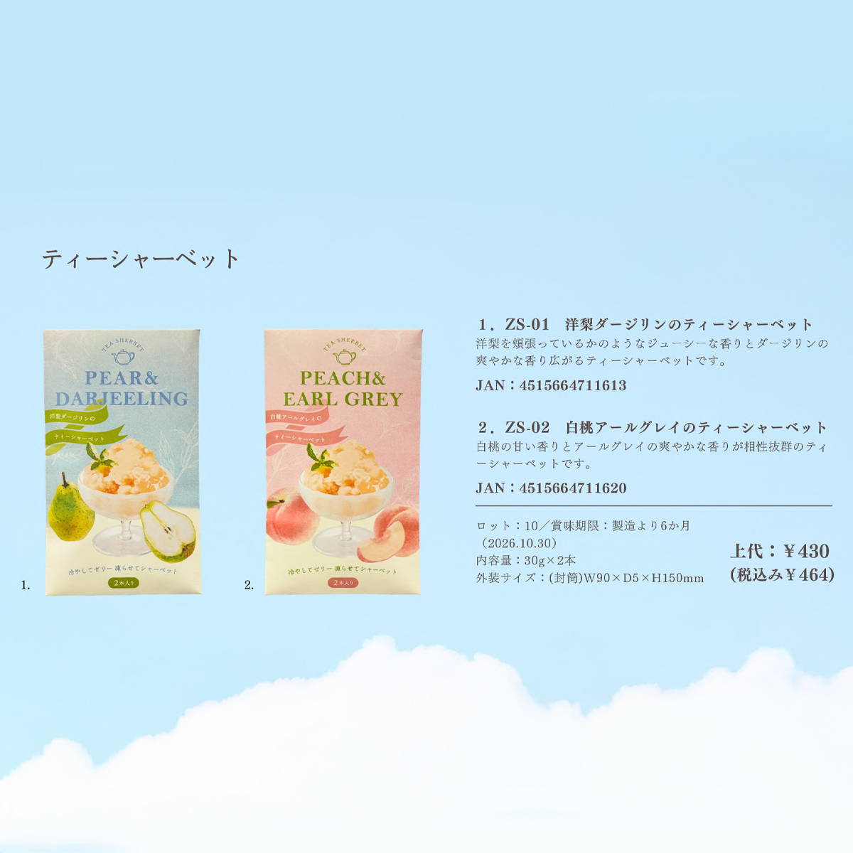 ・白桃アールグレイ:白桃の甘い香りとアールグレイの爽やかな香りが相性抜群のティーシャーベットです。