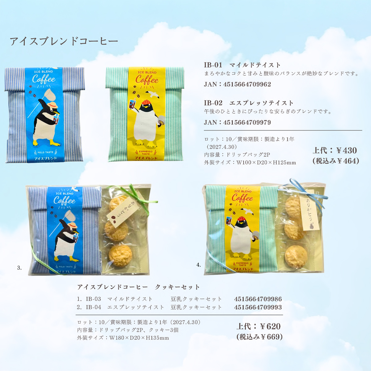 | サイズ | 【アイスブレンドコーヒー】 外装サイズ:W100×D20×H125mm 内容量:ドリップバッグ2P 賞味期限:製造より1年(2027.4.30) 【アイスブレンドコーヒー 豆乳クッキーセット】 外装サイズ:W180×D20×H135mm 内容量:ドリップバッグ2P、クッキー3個 賞味期限:製造より1年(2027.4.30) |