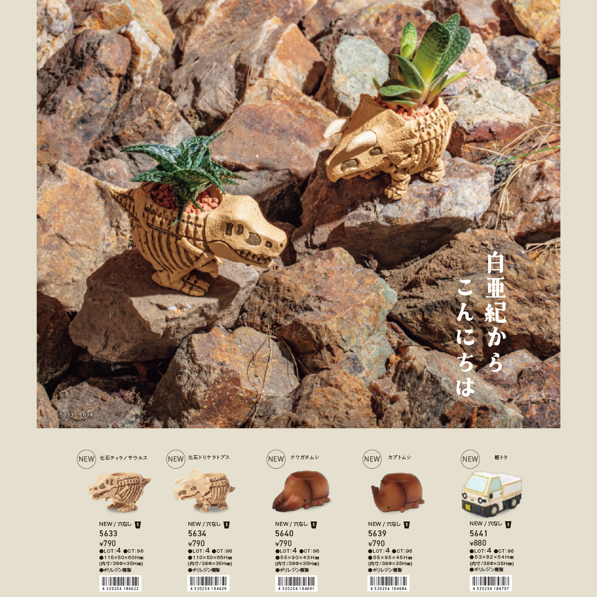 | サイズ | 【5633 リトルレジンポット 化石ティラノサウルス】115×50×60Hmm(内寸:38Φ×35Hmm) 【5634 リトルレジンポット 化石トリケラトプス】110×50×65Hmm(内寸:38Φ×35Hmm) 【5639 リトルレジンポット カブトムシ】55×85×45Hmm(内寸:38Φ×35Hmm) 【5640 リトルレジンポット クワガタムシ】55×90×43Hmm(内寸:38Φ×35Hmm) 【5641 リトルレジンポット 軽トラ】53×82×54Hmm(内寸:38×38×35Hmm) |
