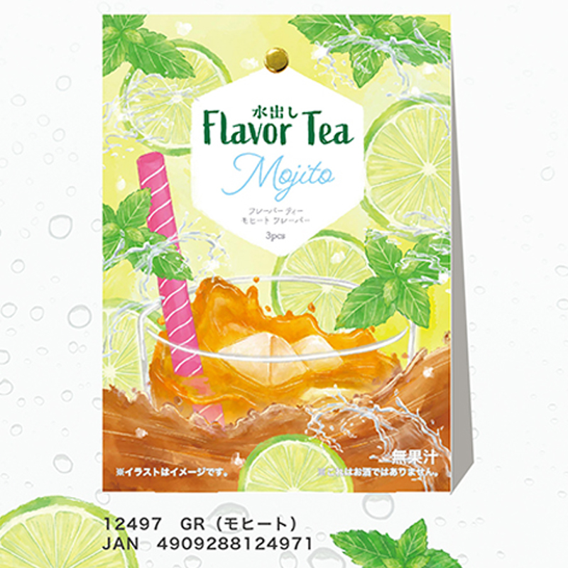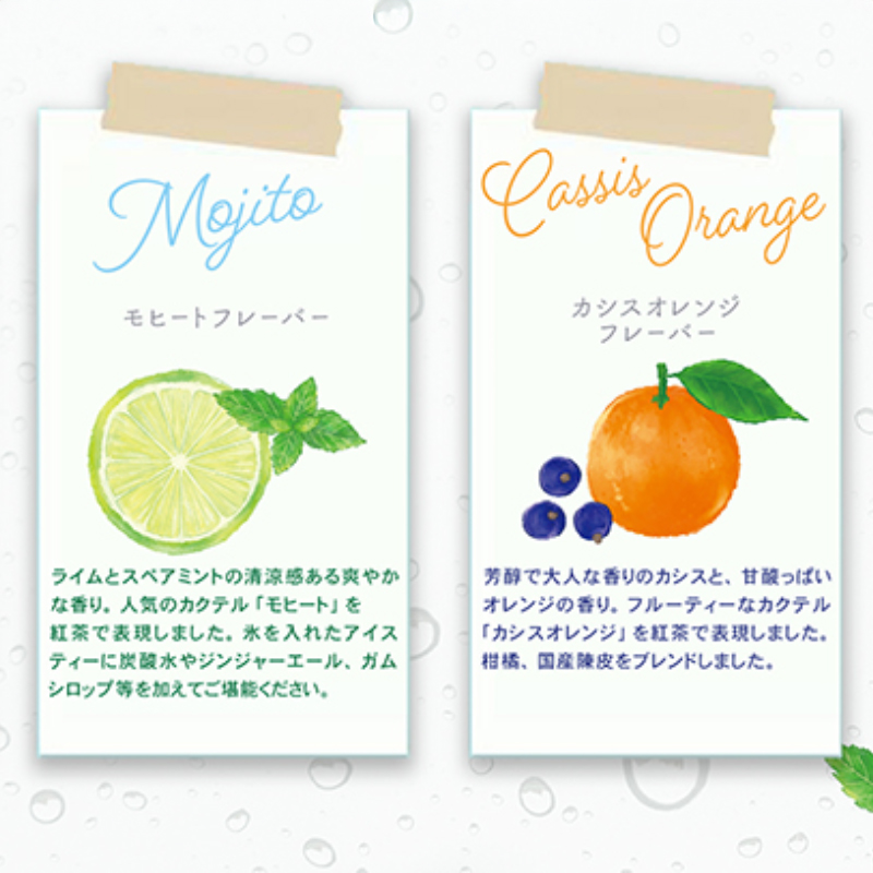 ライムとスペアミントの清涼絡ある爽やかな香り。人気のカクテル「モヒート」を紅茶で表現しました。氷を入れたアイスティーに炭酸水やジンジャーエール、ガムシロップ等を加えてご塔能ください。