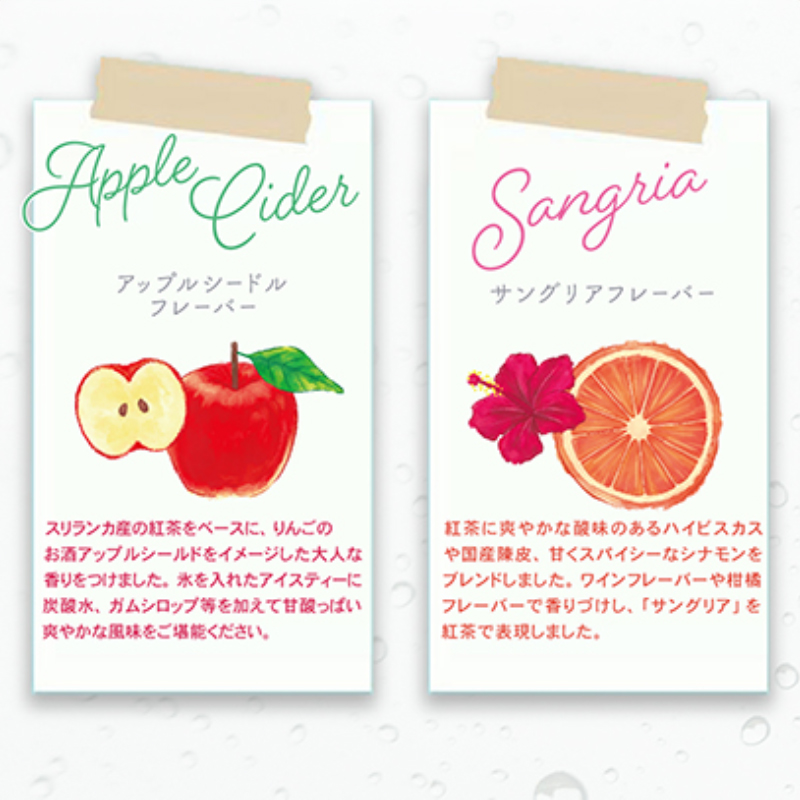 スリランカ産の紅茶をベースに、りんごのお酒アップルシードルをイメージした大人な香りをつけました。氷を入れたアイスティーに淡酸水、ガムシロップ等を加えて甘酸っぱい突やかな風味をご塔能ください。