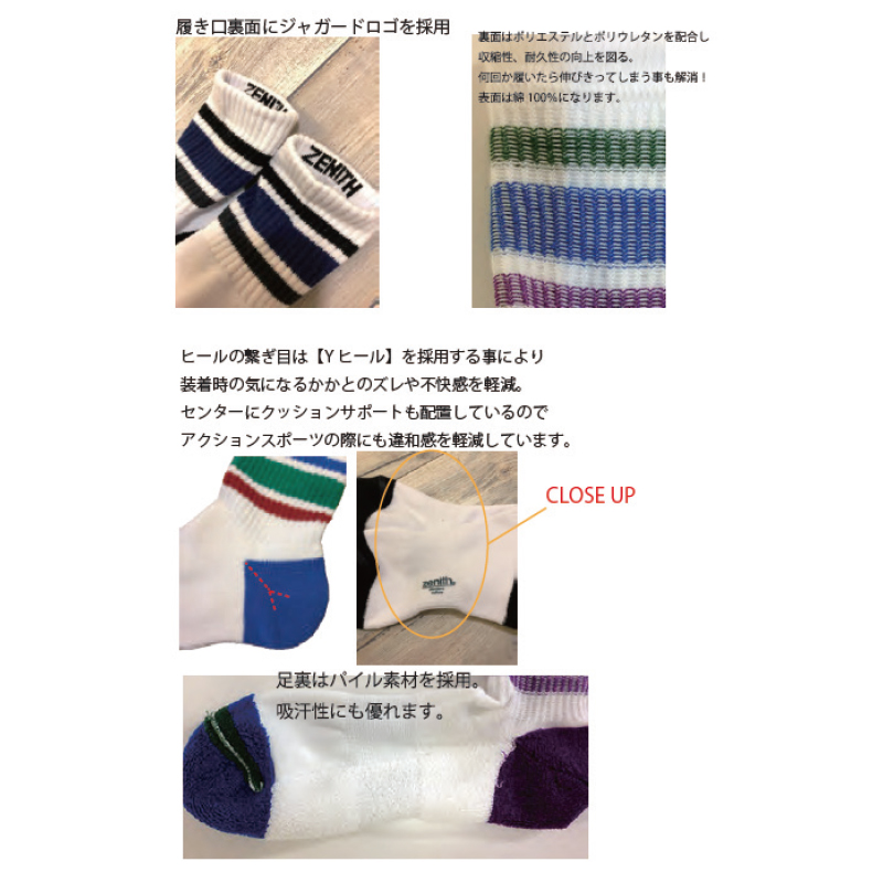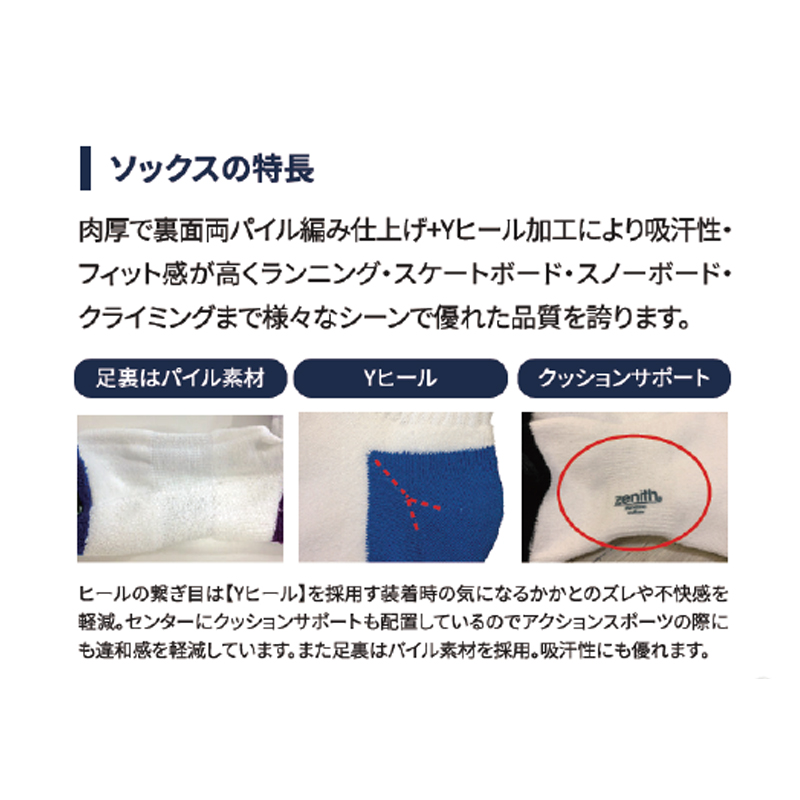 肉厚で裏面両パイル編み仕上げ+Yヒール加工により吸汗性、フィット感が高くランニング・スケートボード・スノーボード・クライミングまで様々なシーンで優れた品質を誇ります。