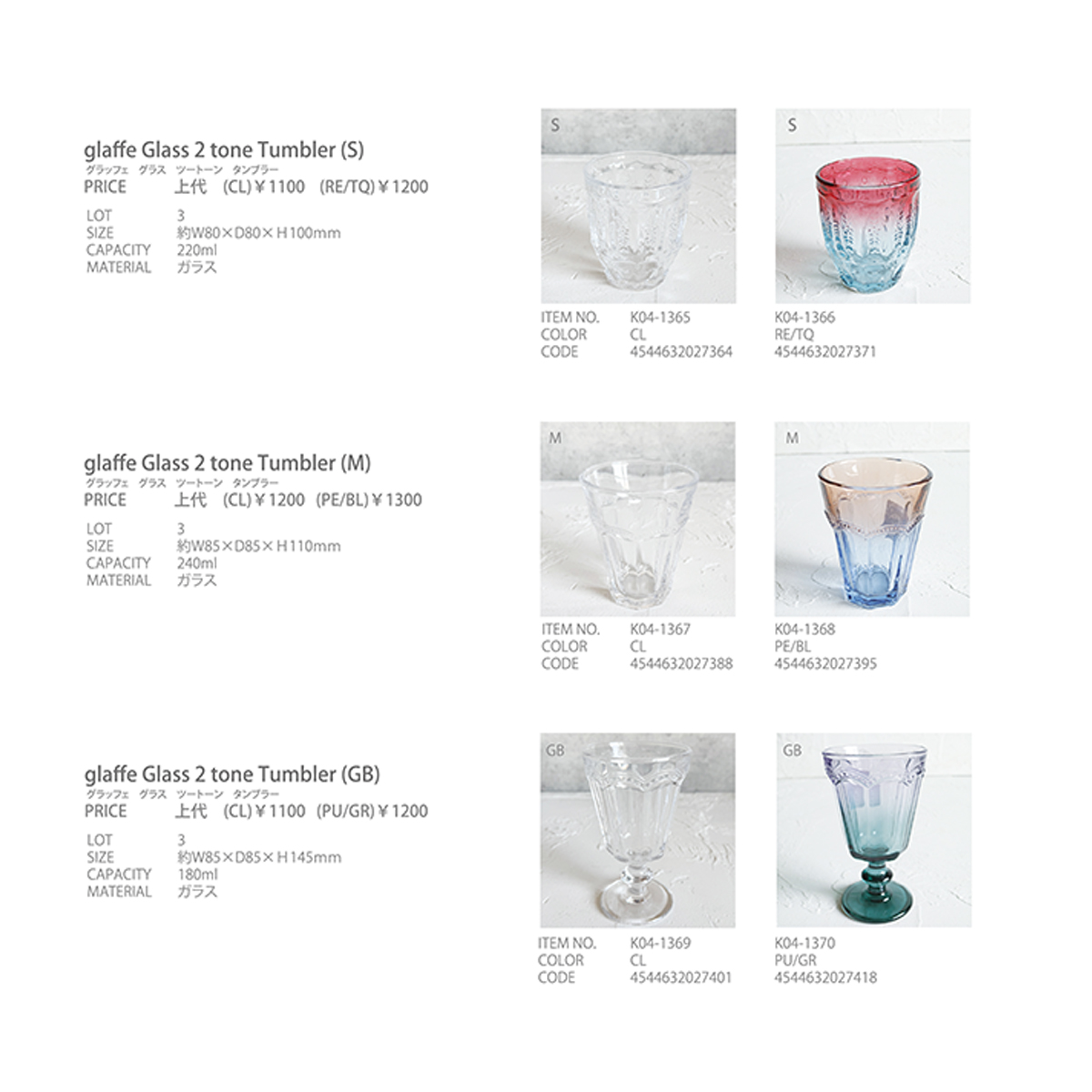 | サイズ | パイナップル トレイ CL S:約W140×D90×H53mm/容量90ml パイナップル トレイ CL L:約W180×D115×H70mm/容量200ml パイナップル トレイ MW S:約W140×D90×H53mm/容量90ml パイナップル トレイ MW L:約W180×D115×H70mm/容量200ml ツートーン タンブラー S :約W80×D80×H100mm/容量220ml ツートーン タンブラー M:約W85×D85×H110mm/容量240ml ツートーン タンブラー GB:約W85×D85×H145mm/容量180ml デコ グラス ヴェセル パイナップル:約W85×D85×H95mm デコ グラス ヴェセル ストロベリー:約W95×D95×H130mm デコ グラス ヴェセル アップル:約W100×D100×H115mm |
