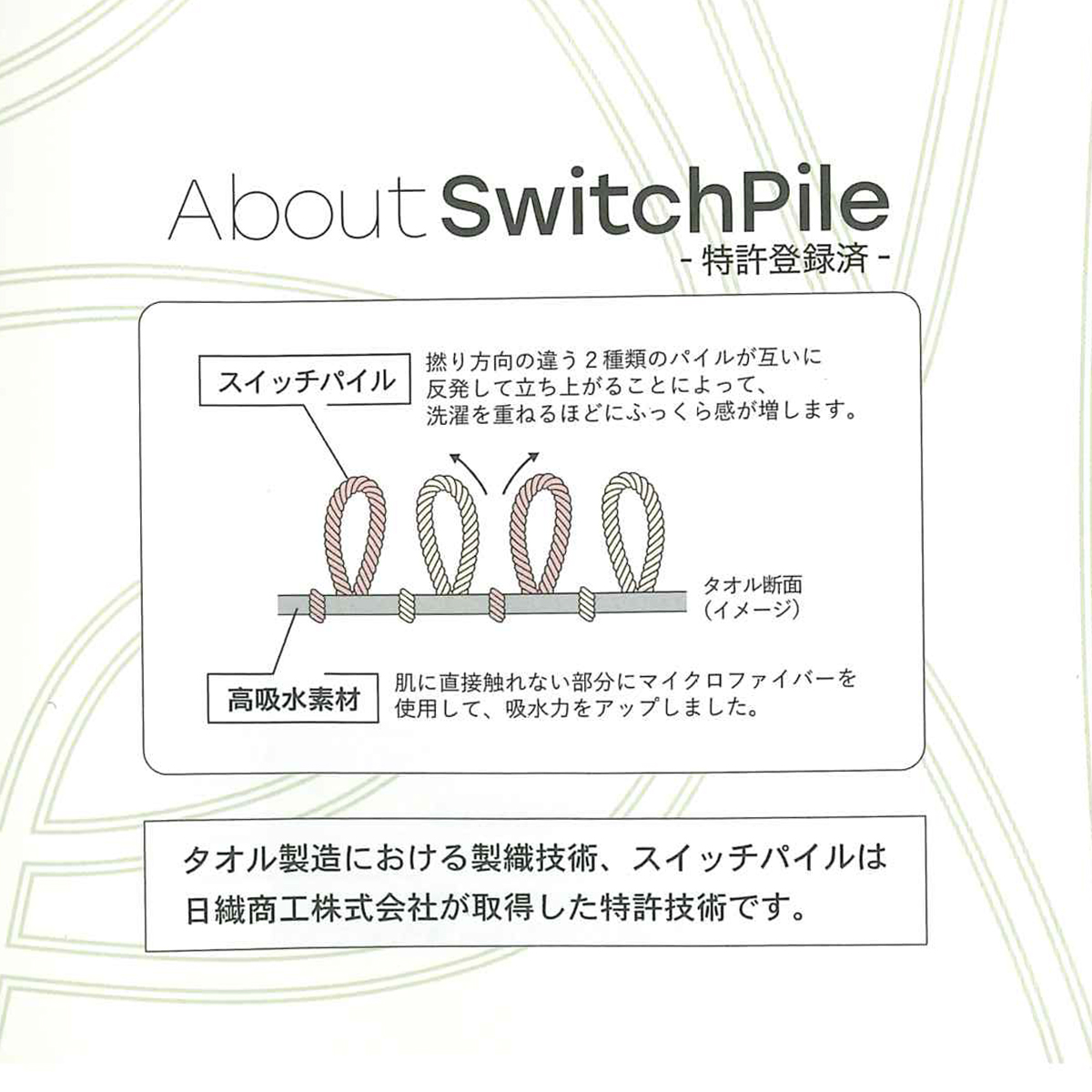 ”洗うほどに膨らむタオル”をテーマに開発されたスイッチパイルは洗ってもパイルがへたりにくく膨らみのある風合いを持続させる製造技術です。