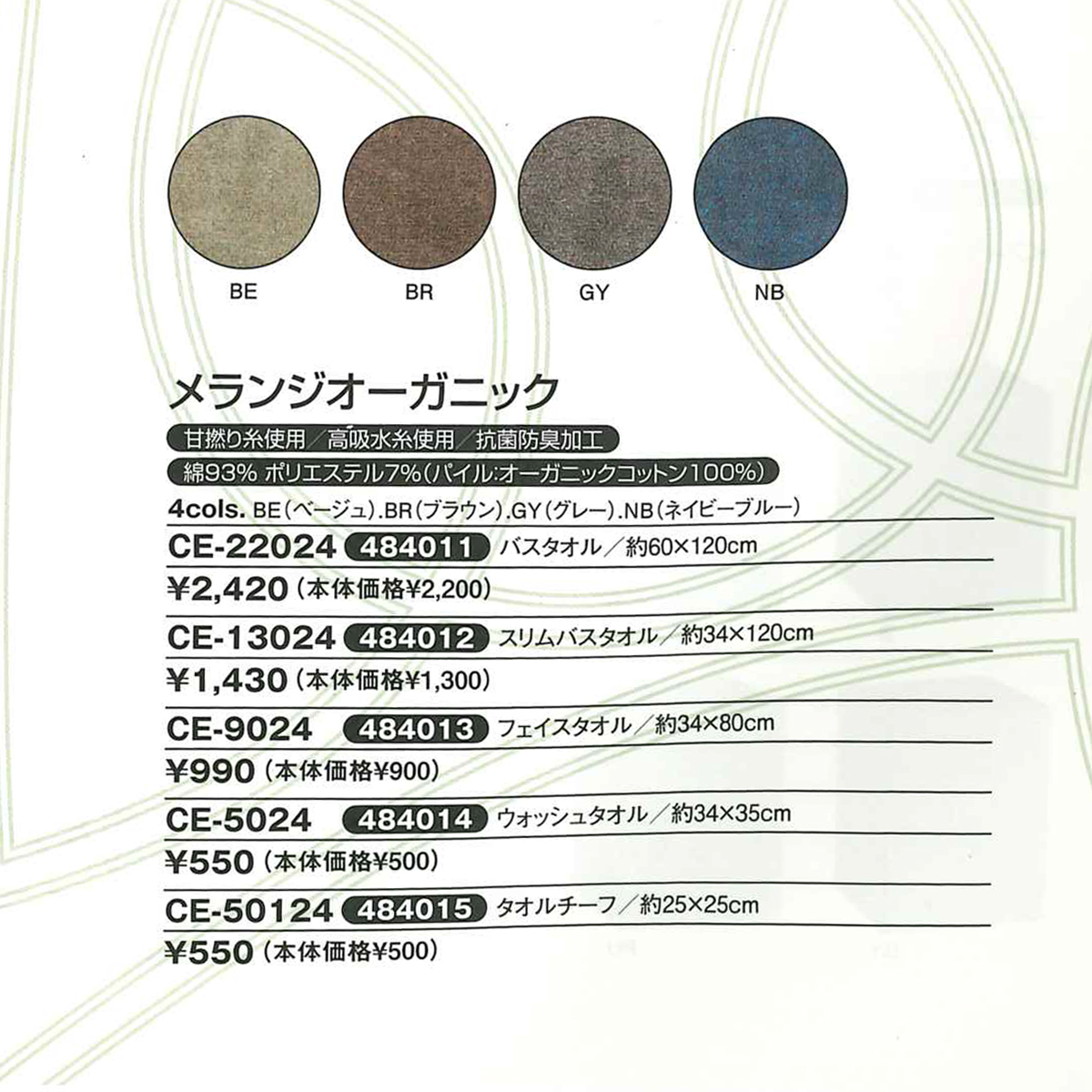 | サイズ | バスタオル:約60×120cm スリムバスタオル:約34×120cm フェイスタオル:約34×80cm ウォッシュタオル:約34×35cm タオルチーフ:約25×25cm |