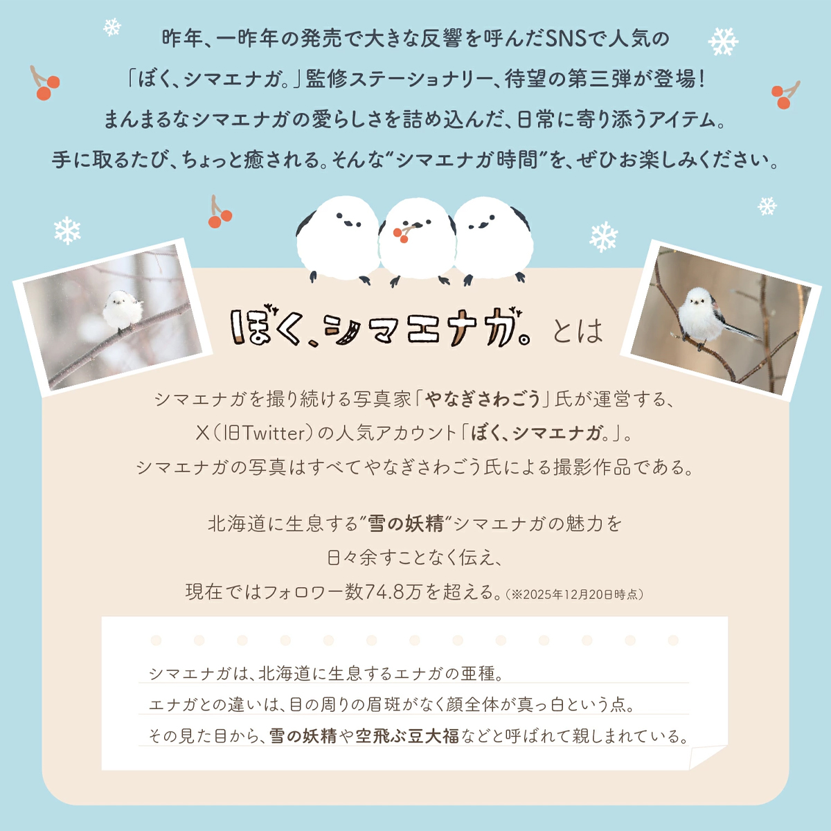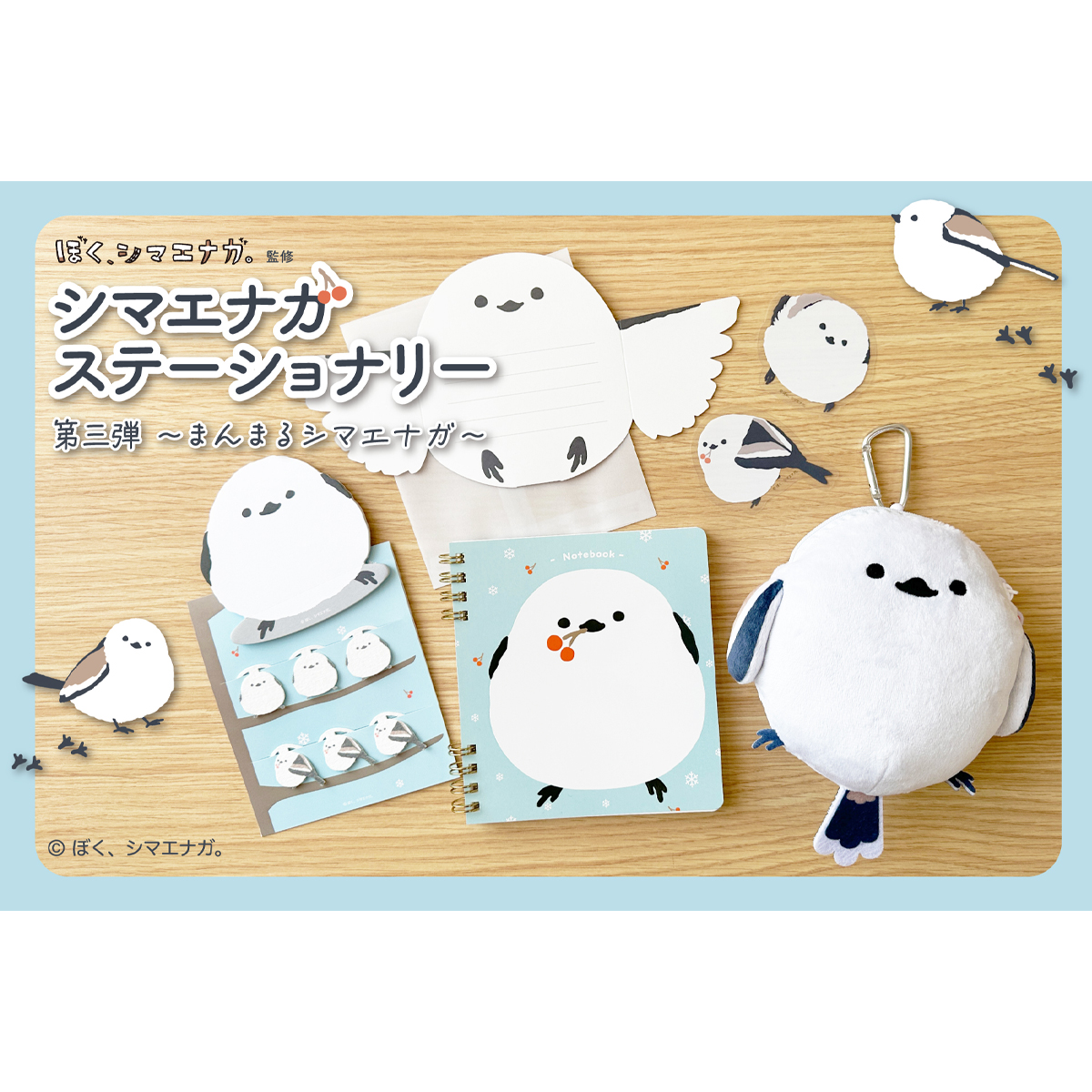 昨年、一昨年の販売で大きな影響を呼んだSNSで人気の「ぼく、シマエナガ。」監修ステーショナリー、待望の第三弾が登場!