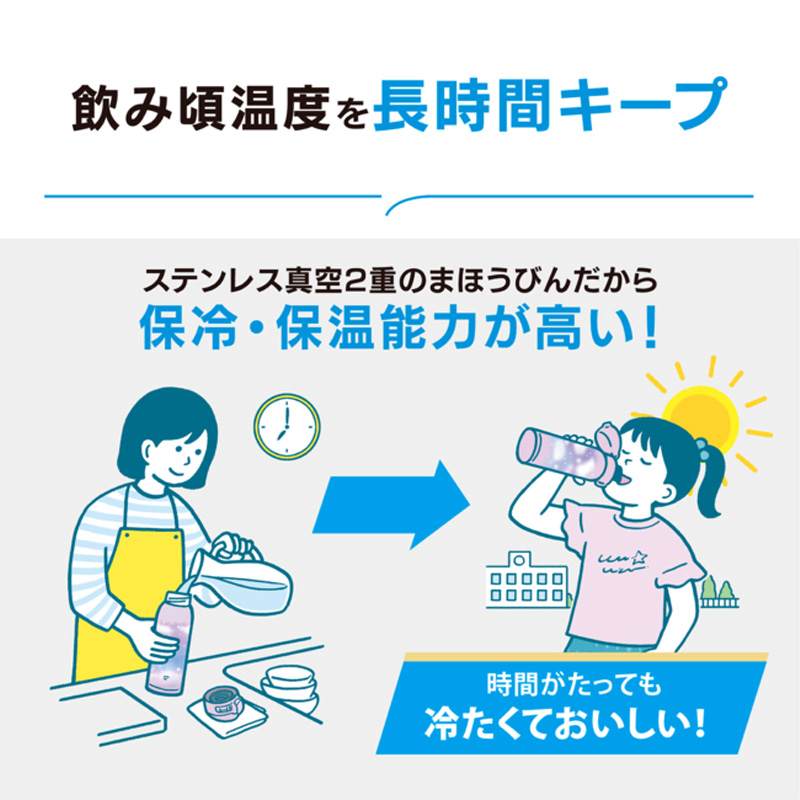 ステンレス真空2重のまほうびんだから、保冷・保温力が高い!