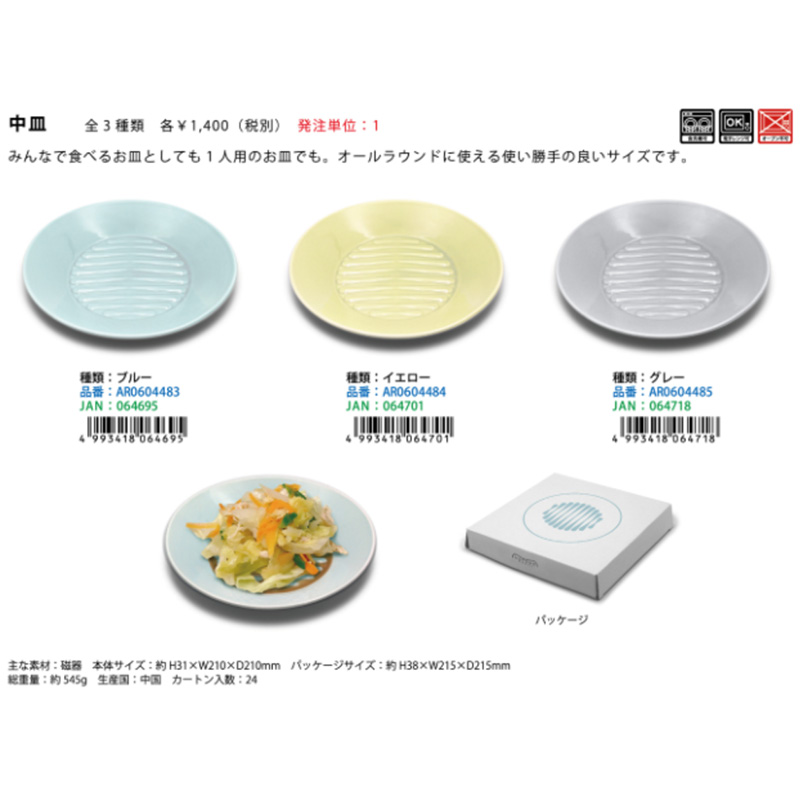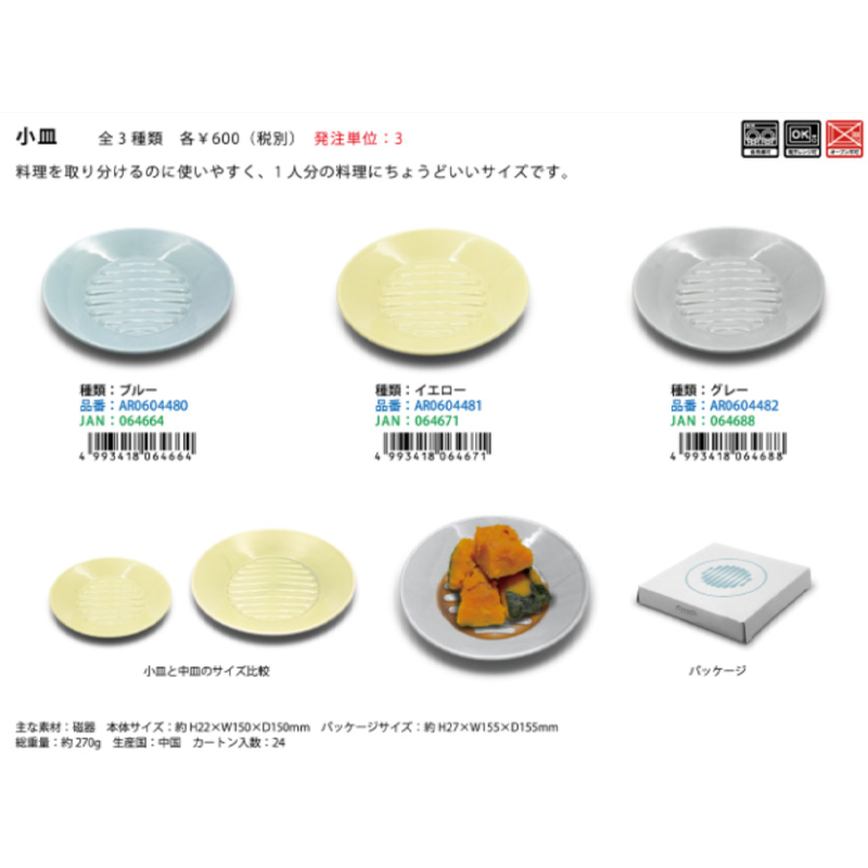 | サイズ | 小皿:本体サイズ:約H22×W150×D150mm/パッケージサイズ:約H27×W155×D155mm 総重量:約270g 中皿:本体サイズ:約H31×W210×D210mm/パッケージサイズ:約H38×W215×D215mm 総重量:約545g |