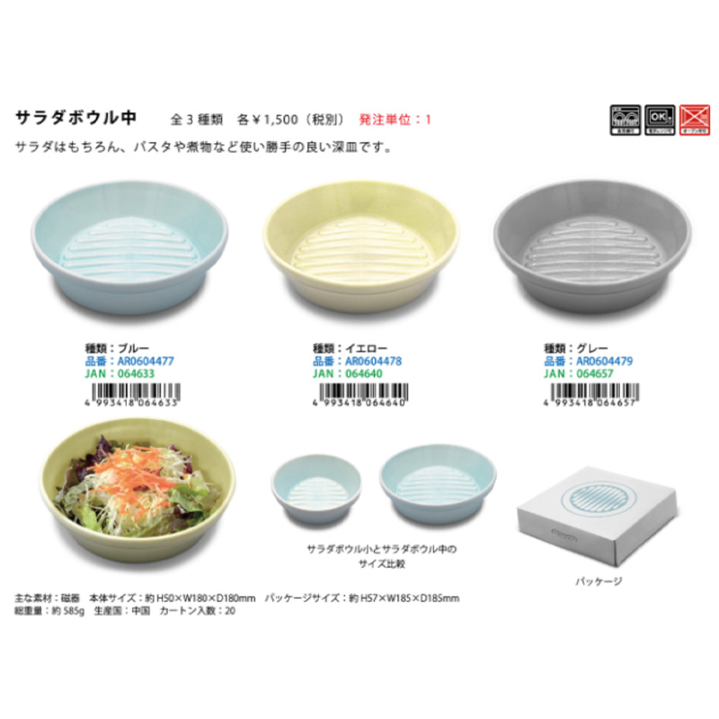 | サイズ | サラダボウル小:本体サイズ:約H50×W140×D140mm パッケージサイズ:約H57×W145×D145mm 総重量:約375g サラダボウル中:本体サイズ:約H50×W180×D180mm パッケージサイズ:約H57×W185×D185mm 総重量:約585g |