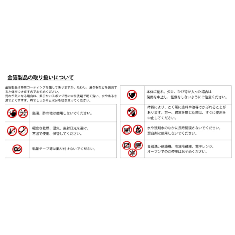 金箔製品は特殊コーティングを施してありますが、たわし、磨き粉などを使用すると傷がつきますのでおやめください。