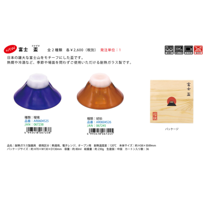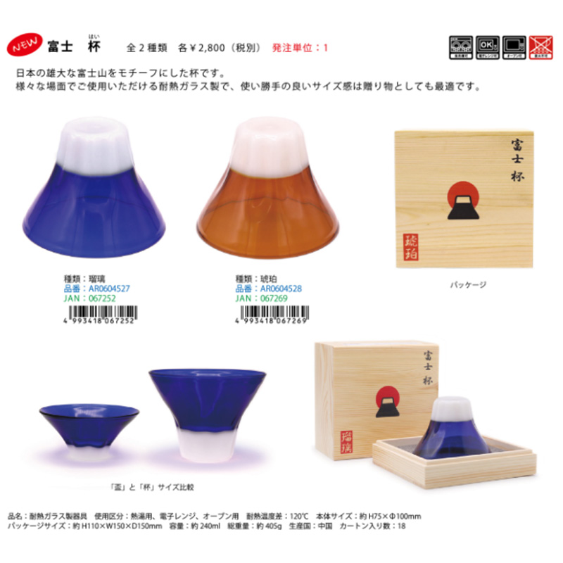 杯:日本の雄大な富士山をモチーフにした杯です。様々な場面でご使用いただける耐熱ガラス製で、使い勝手の良いサイズ感は贈り物としても最適です。
