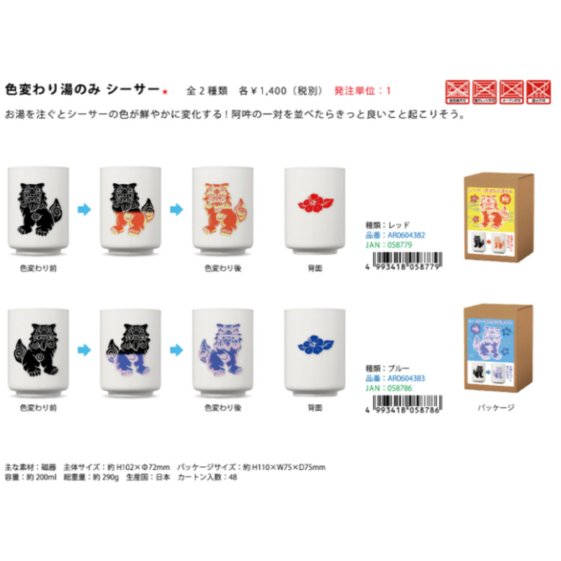 お湯を注ぐとシーサーの色が鮮やかに変化する!阿吽の一対を並べたらきっと良いこと起こりそう。