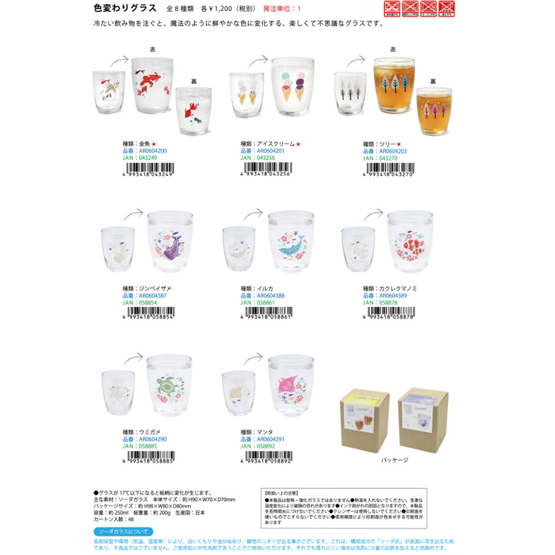 冷たい飲み物を注ぐと、魔法のように鮮やかな色に変化する、楽しくて不思議なグラスです。