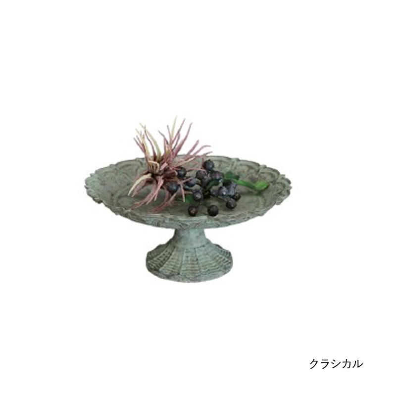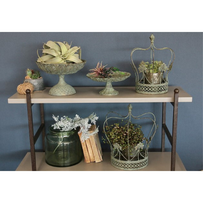 繊細な装飾と、緑青のようなくすみを帯びたアンティーク調の仕上げが、植物や小物を上品に引き立てます。