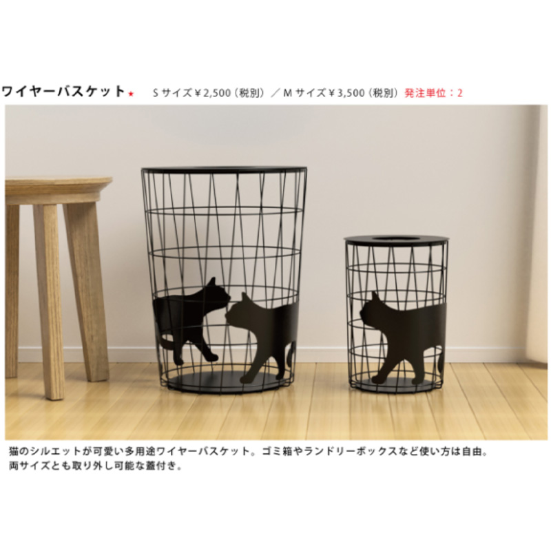 猫のシルエットが可愛い多用途ワイヤーバスケット。ゴミ箱やランドリーボックスなど使い方は自由。両サイズとも取り外し可能な蓋付き。