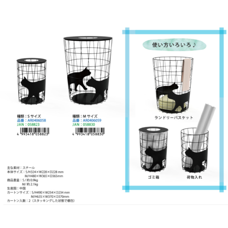 ワイヤーバスケット S&Mサイズ 猫シルエット 収納 ランドリー/ゴミ箱にも