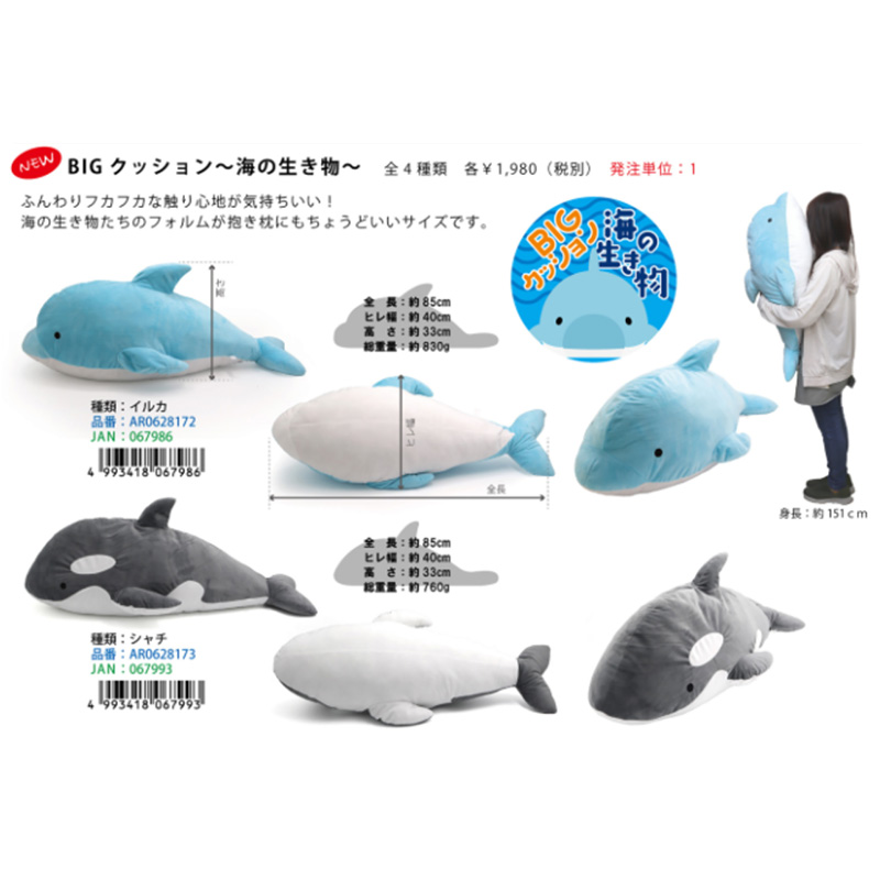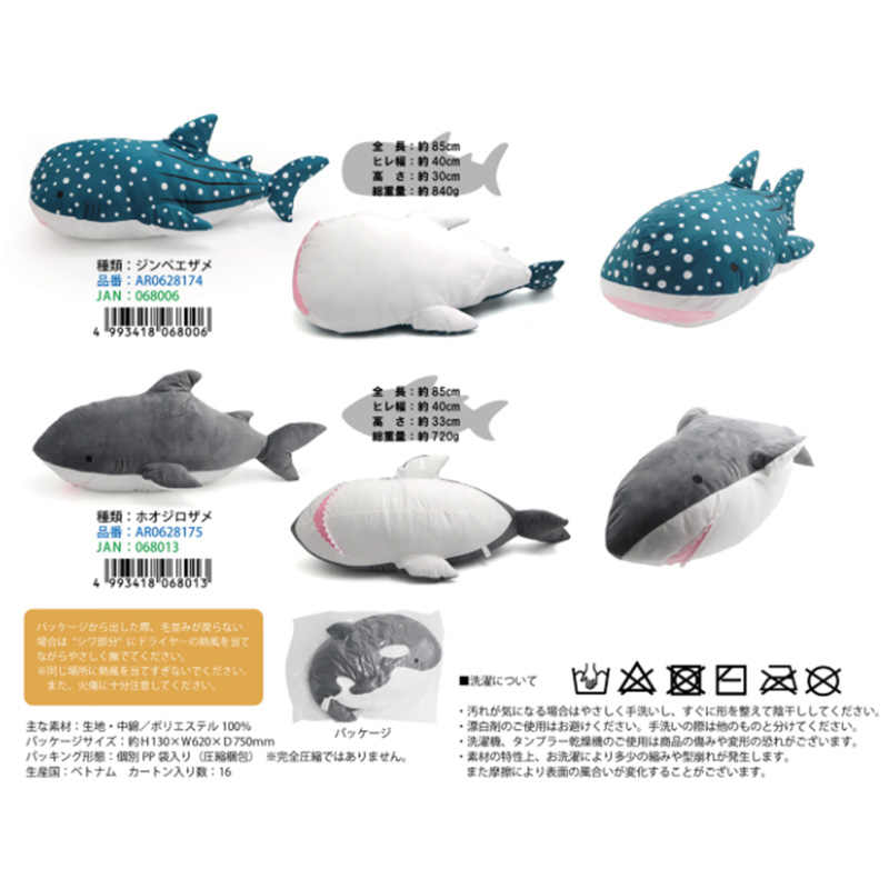 | サイズ | パッケージサイズ:約H130×W620×D750mm(圧縮袋)※完全圧縮ではありません イルカ:全長約85cm、ヒレ幅約40cm、高さ約33cm、総重量約830g シャチ:全長:約85cm、ヒレ幅:約40cm、高さ:約30cm、総重量:約840g ジンベエザメ:全長:約85cm、ヒレ幅:約40cm、高さ:約30cm、総重量:約840g ホオジロザメ:全長:約85cm、ヒレ幅:約40cm、高さ:約33cm、総重量:約720g |