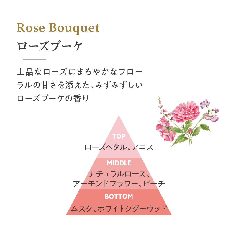 ローズブーケ:上品なローズにまろやかなフローラルの甘さを添えた、みずみずしいローズブーケの香り