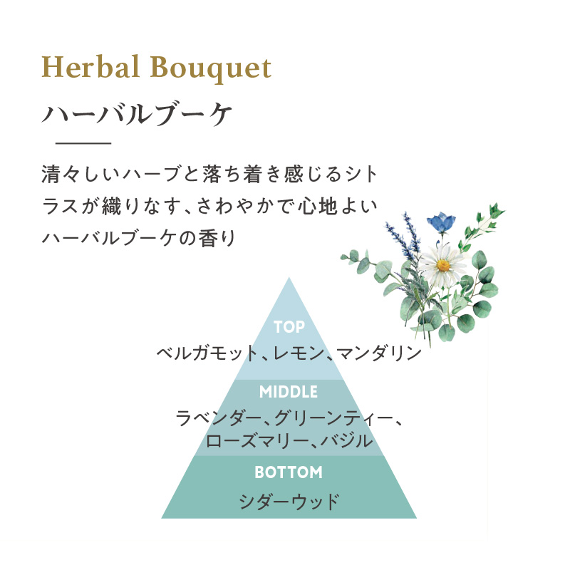 ハーバルブーケ:清々しいハーブと落ち着き感じるシトラスが織りなす、さわやかで心地よいハーバルブーケの香り