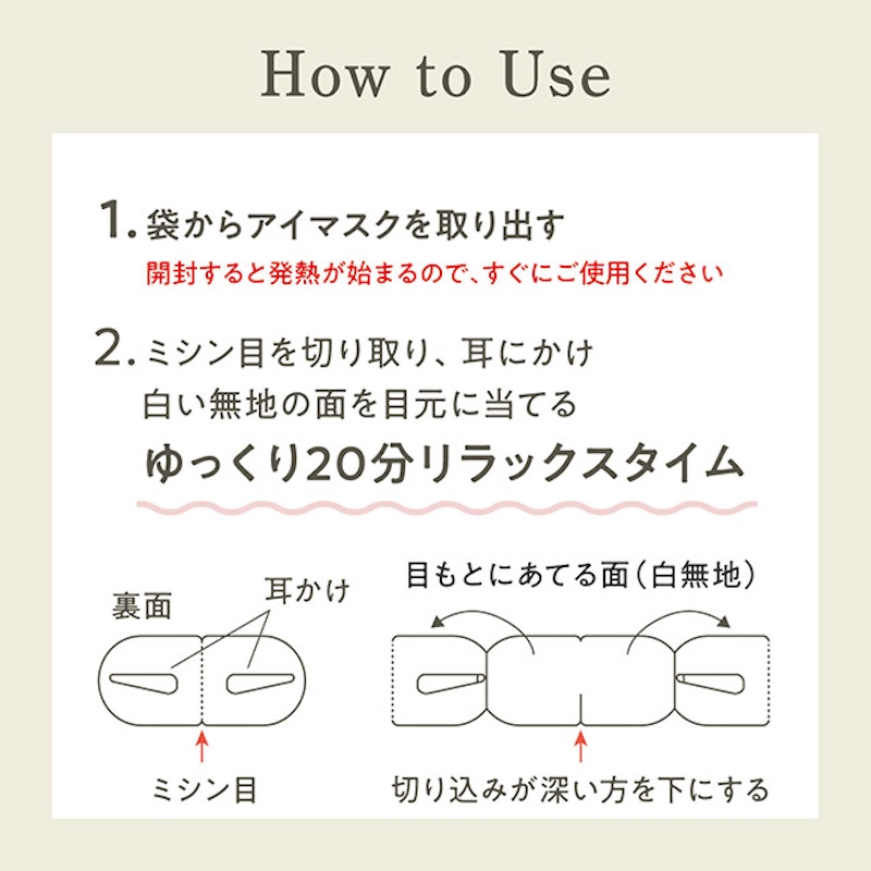 天然精油配合の安らぎアロマがふんわり香るアロマタイプの温熱アイマスク。じんわり心地よい蒸気で目と目元を温め、気分ほどけるリラックスタイムを。