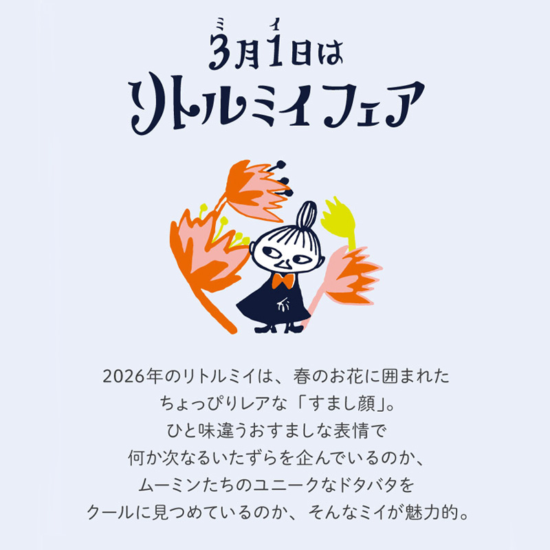 春のお花に囲まれたちょっぴりレアな「すまし顔」のリトルミイ ひと味違うおすましな表情で何か次なるいたずらを企んでいるのかムーミンたちのユニークなドタバタをクールに見つめているのか、そんなミイが魅力的。