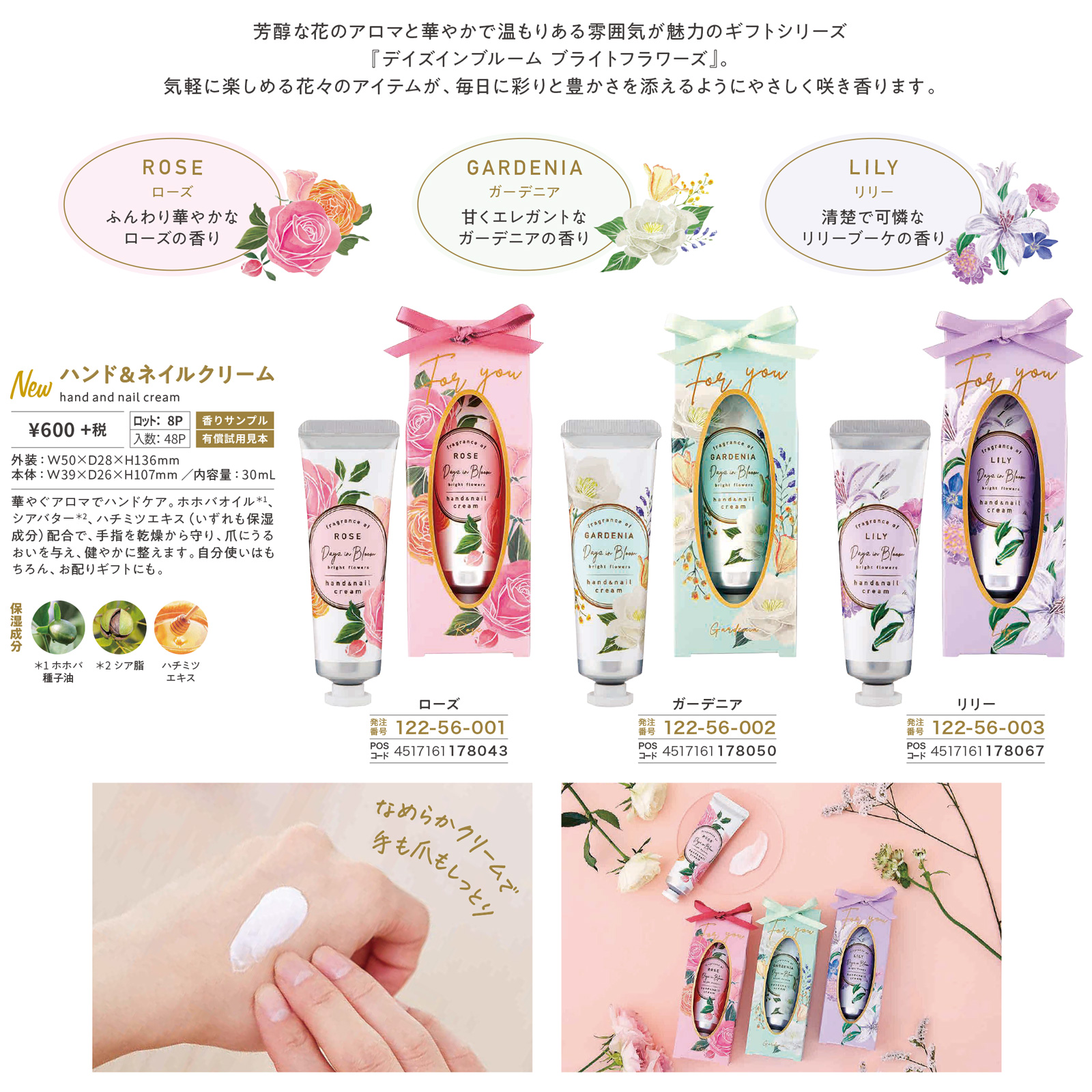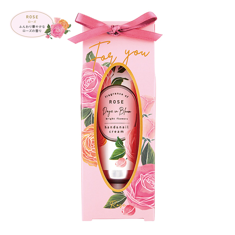 華やぐアロマでハンドケア。ホホバオイル*、シアバター*、ハチミツエキス(いずれも保湿成分)配合で、手指を乾燥から守り、爪にうるおいを与え、健やかに整えます。自分使いはもちろん、お配りギフトにも。