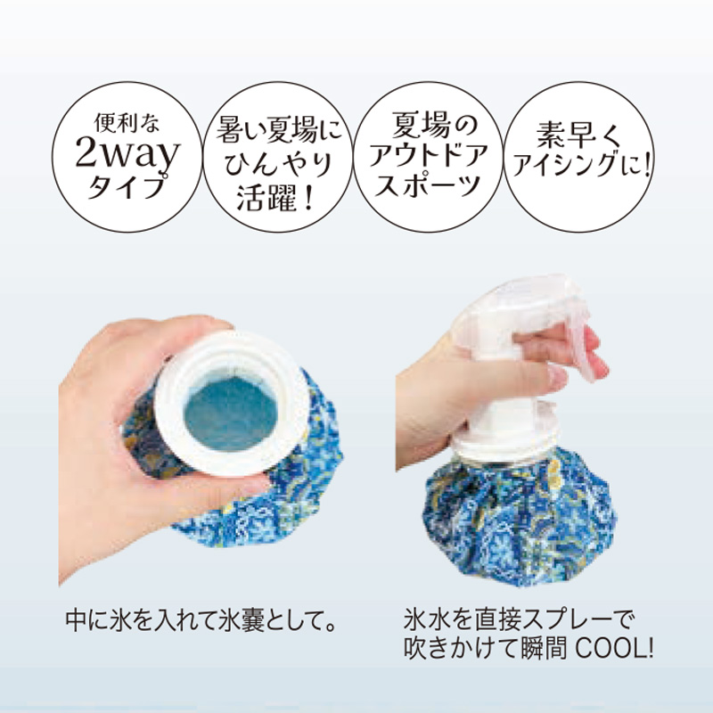 繰り返し使える氷嚢に便利なスプレーが付いて、 氷温ミストで速感COOL!