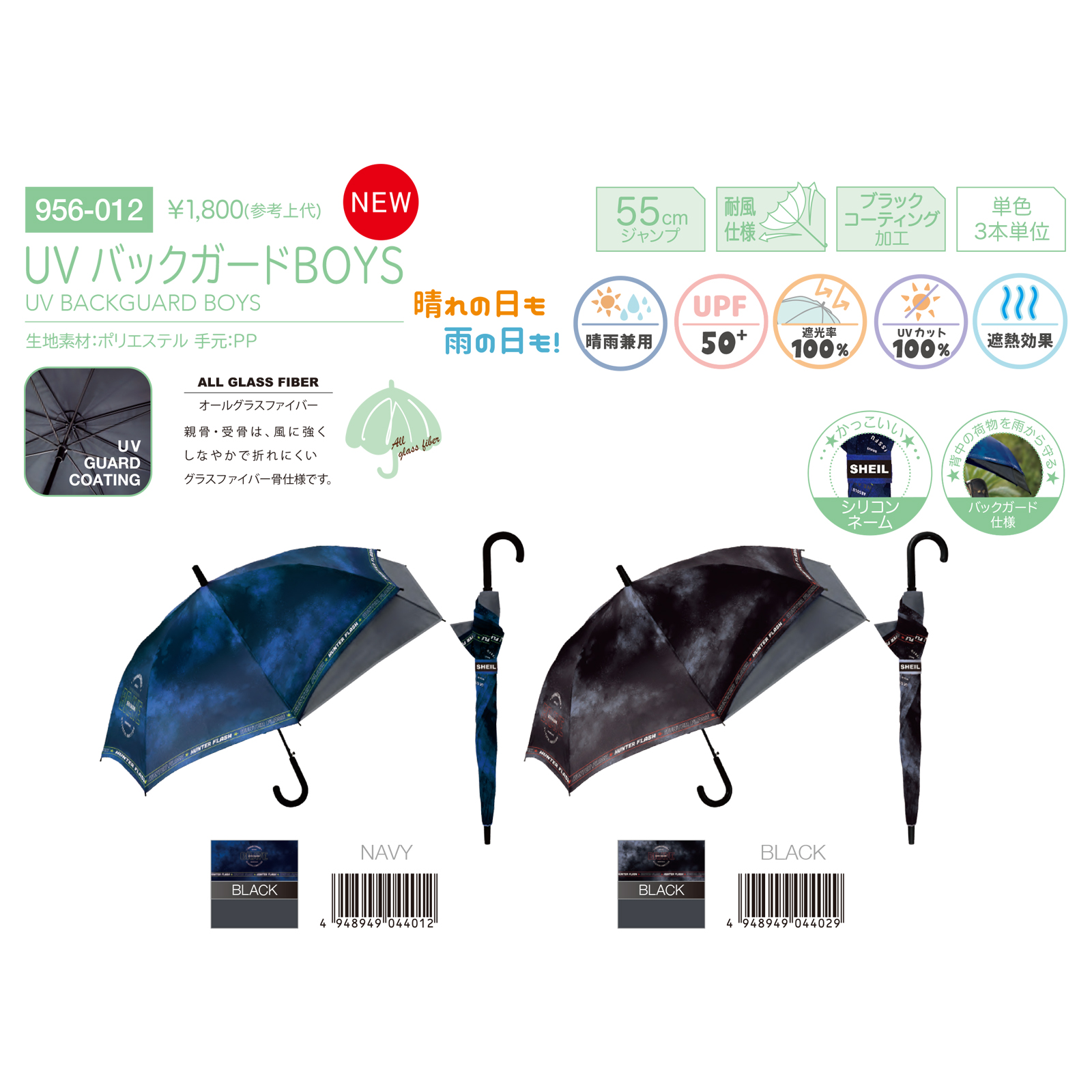 UV バックガードBOYS 55cm 長傘 晴雨兼用 遮光率100% UVカット100% 男子