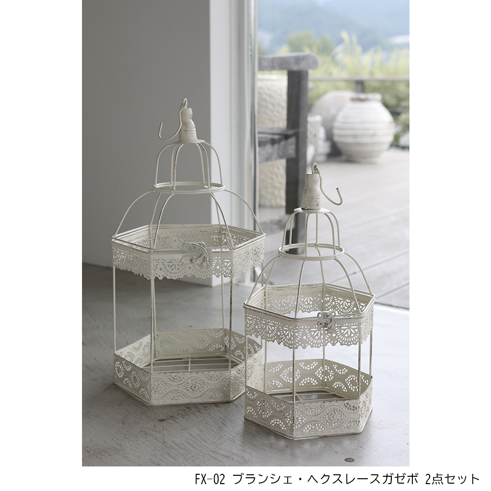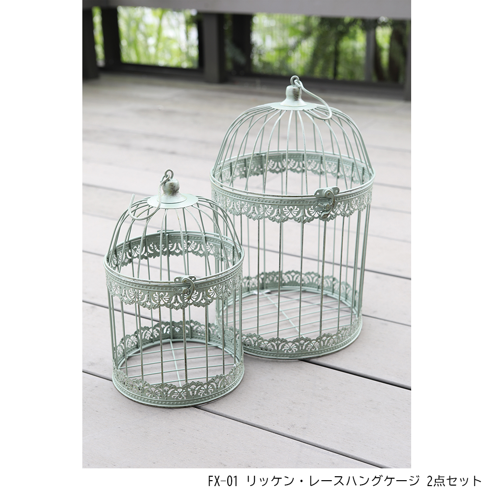 | サイズ | 【FX-01 リッケン・レースハングケージ 2点セット】 L.Φ25×H40cm S.Φ19×H31cm 口径:L.Φ24cm S.Φ18cm 深さ:L.24.5cm S.17.5cm 耐荷重:各0.5kg 上部が開閉します 【FX-02 ブランシェ・ヘクスレースガゼボ 2点セット】 L.W26×D24×H48cm S.W21×D19×H40cm 口径:L.W24.5×D22cm S. W19.5×D17cm 深さ:L.24.5cm S.17.5cm 耐荷重:各0.5kg 上部が開閉します |