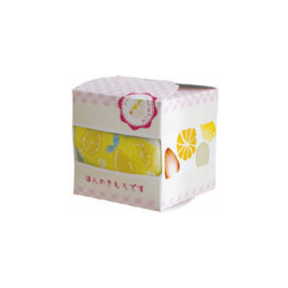みずみずしいフルーツを織り込んだタオルハンカチを、フルーツサンド柄のかわいいキューブボックスにセットしました。