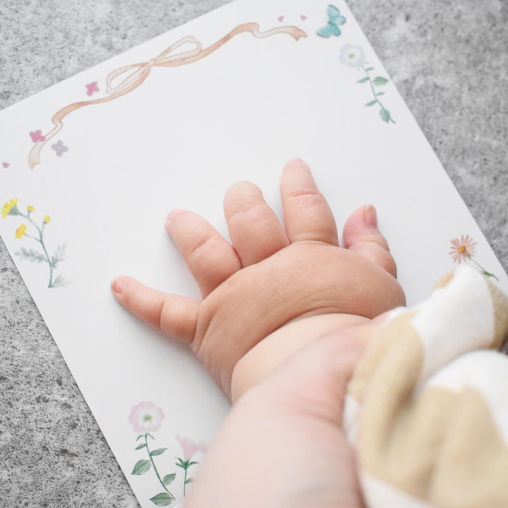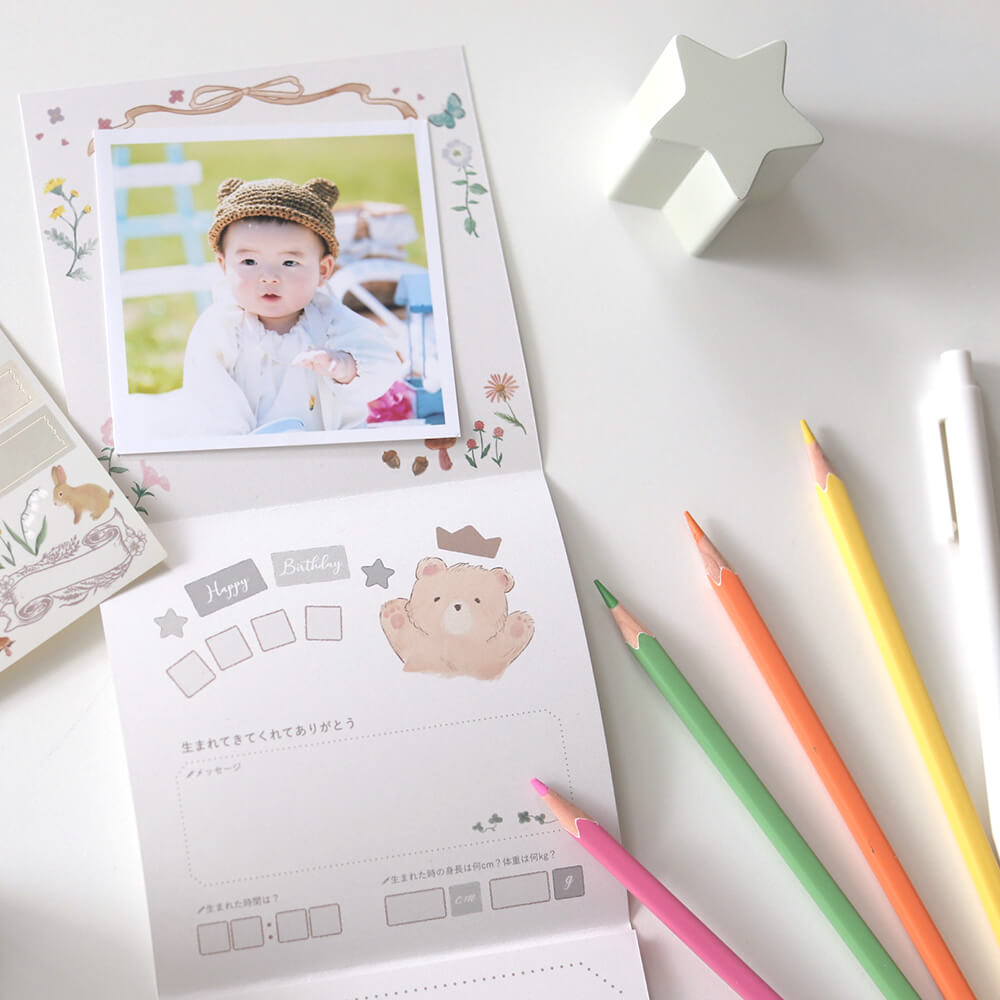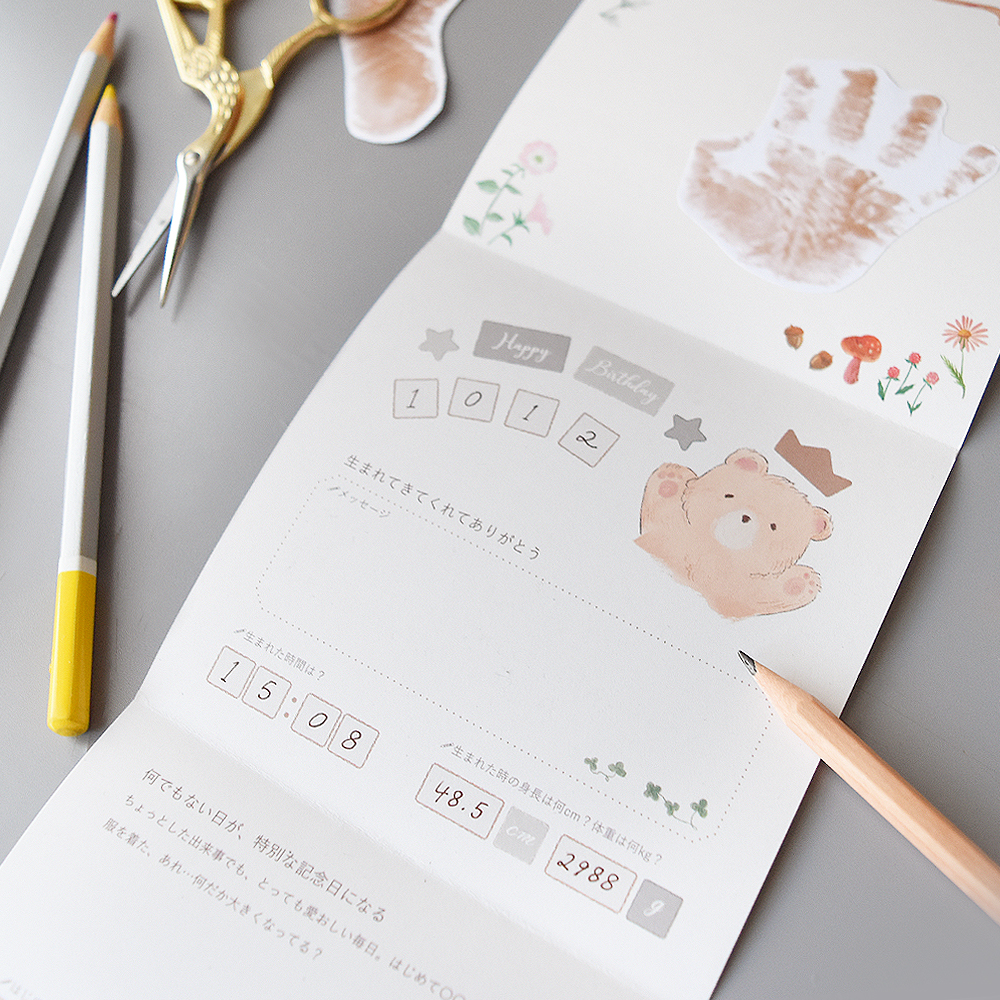 付属のリーフレットには手形や足形を押したり、写真を貼ったり、特別な思い出を記入して…あなただけの成長日記の出来上がり。