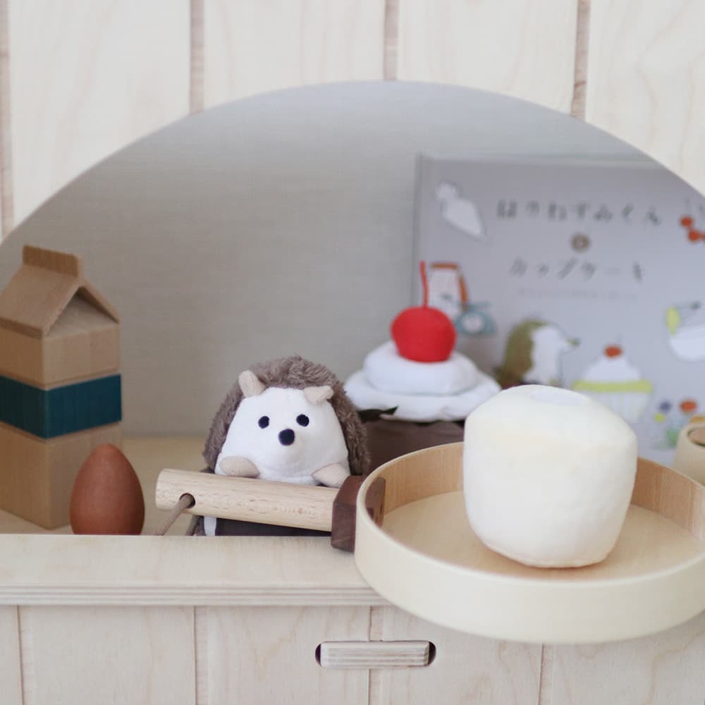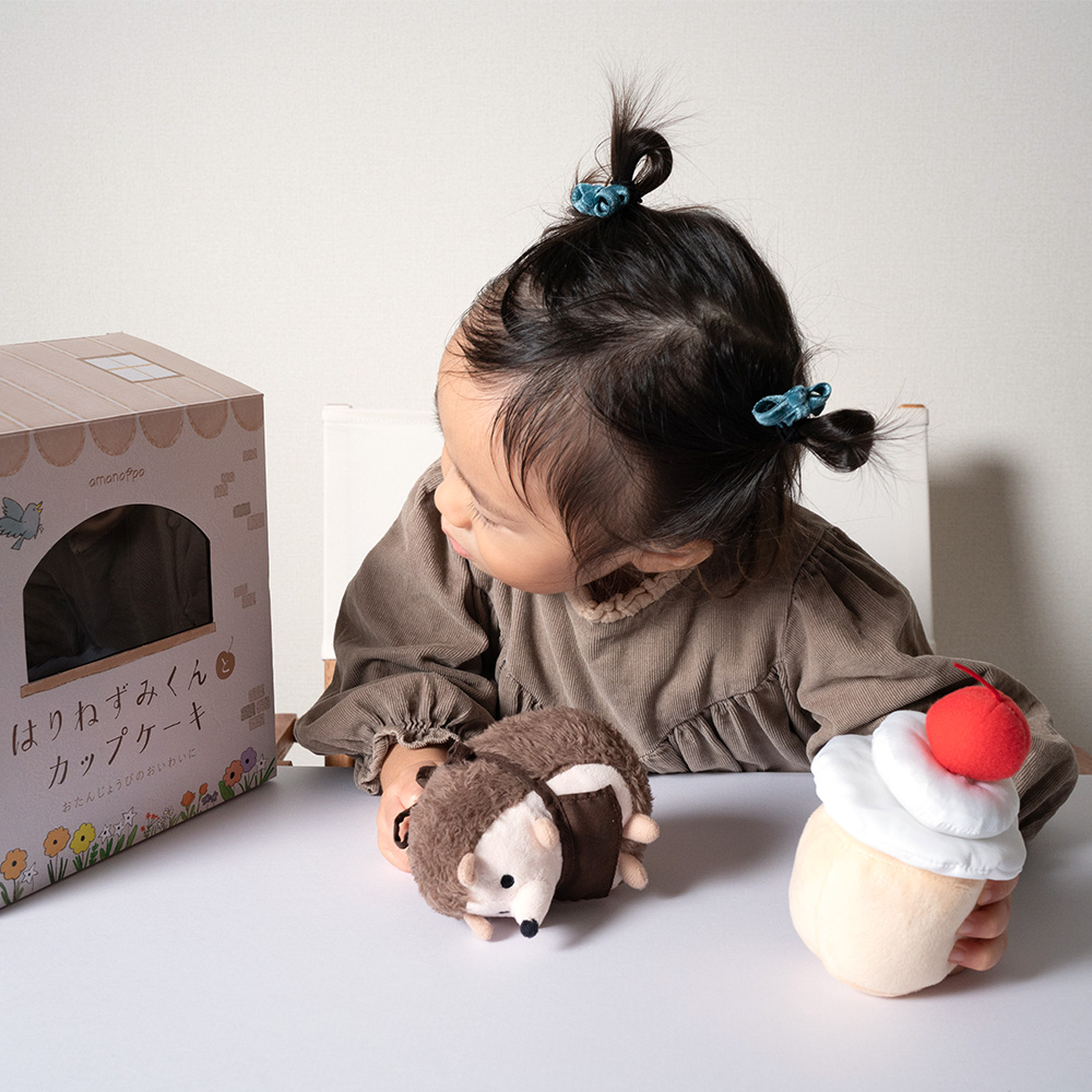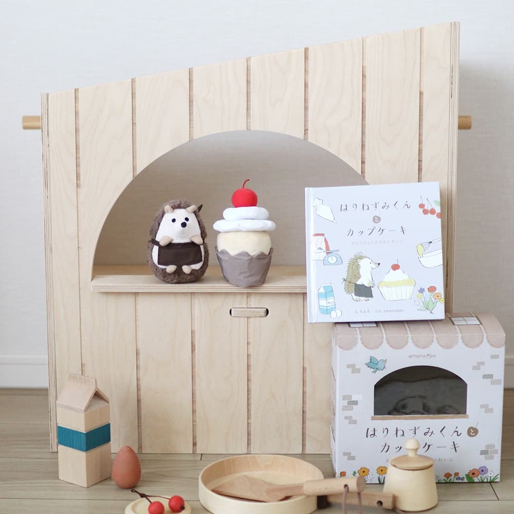 えほんに出てくるはりねずみくんのぬいぐるみと、みんなで作った美味しいカップケーキのおもちゃがセットになっています。
