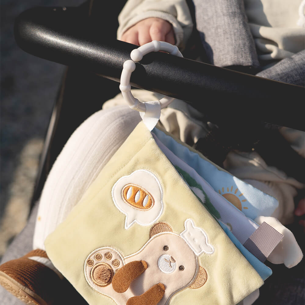 カラビナ付きなので、ベビーカーやバッグに付けてどこへでもお供します。
