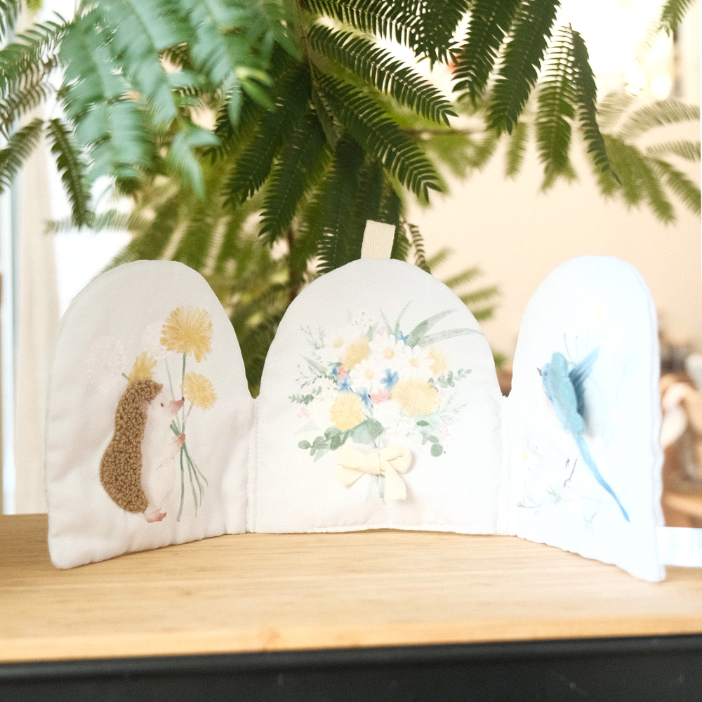 ぬのえほんはお気に入りのページの向きに飾ったり、 立てておくことができます。